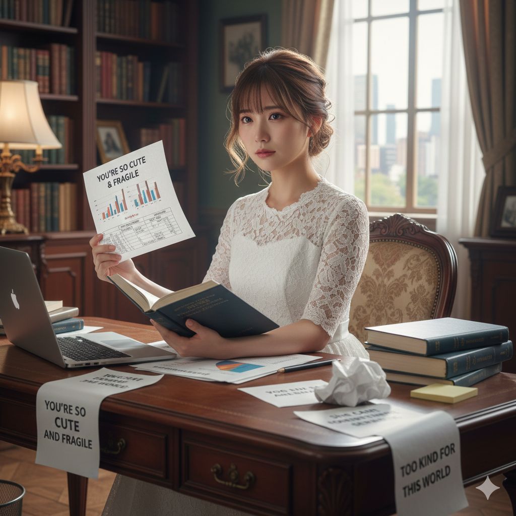 A modern, emotional J-pop ballad with cinematic elements, Soft female vocals that begin whispery and gentle, but grow powerful and emotional in the chorus, Sound: Deep piano, low cello, subtle electronic pads, light percussions, reverb-heavy ambiance, Mood: urban night, introspective, feminine strength, quiet rebellion, identity conflict, Theme: A woman who is perceived as soft and gentle, but inside she is analytical, sharp, strong, She struggles between others’ stereotypes and her own true self, Music should shift from quiet tension to powerful emotional release, Beautiful, melancholic, empowering