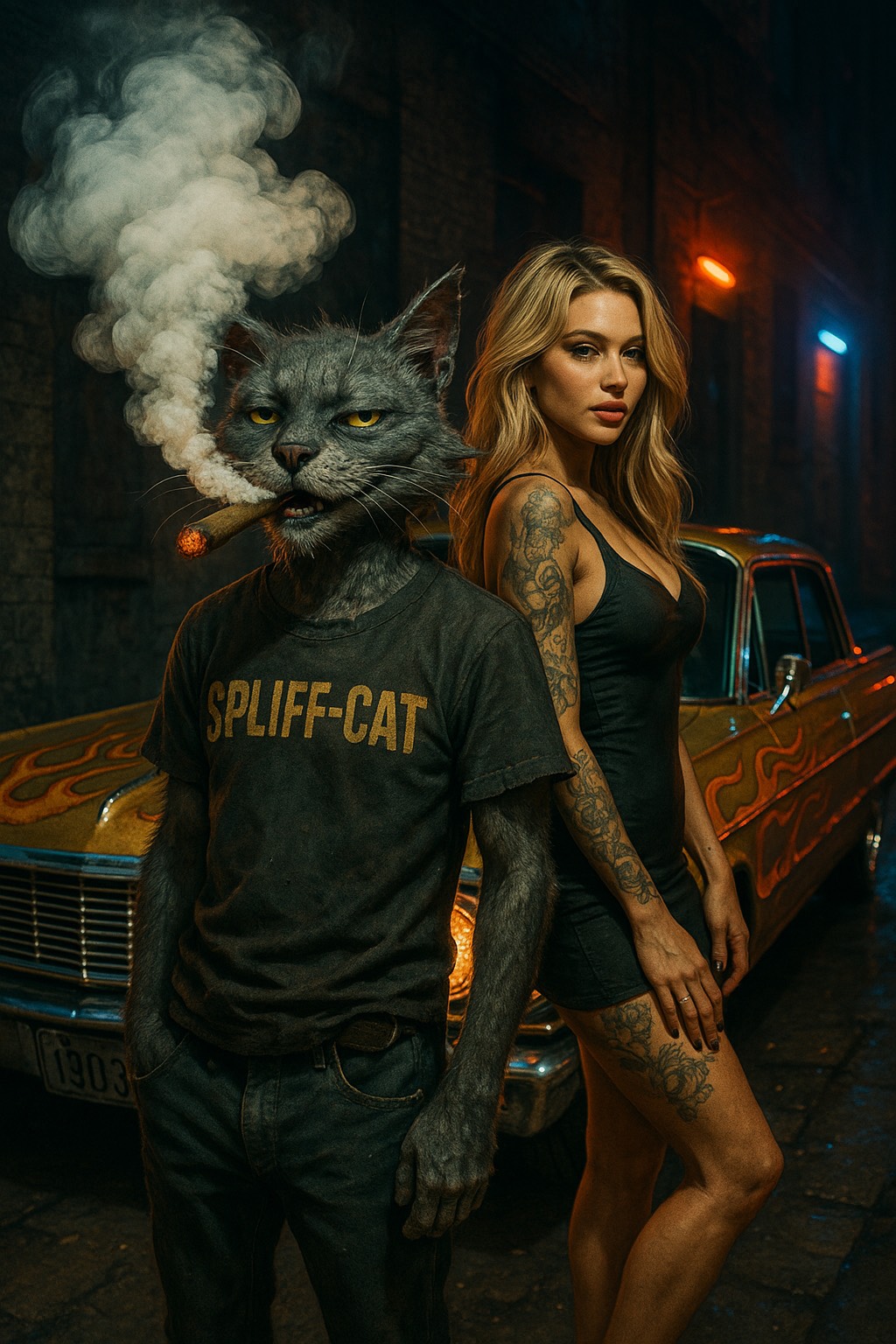 Male rap vocal with rapid-fire West Coast cadence, aggressive stutter catches, dense internal rhymes, tight triplet flows, and clear enunciation even at high BPM, Tone confident, smoky, cocky, slightly comedic gangster energy, Delivery sharp, forward, rhythmically locked with the drums, No melody singing, Beat: West Coast lowrider vibe mixed with modern fast rap, Heavy 808s tuned at 45 to 55Hz, punchy kick, crisp snare, hydraulic-style SFX, vinyl crackle accents, deep sub slides, and G-funk inspired synth leads, Tempo fast but steady, Mix: wide stereo, clean transients, strong low-end weight, light saturation on vocals, minimal reverb, Hook sections more anthemic with chant-like cadence, Overall feel: cruising in a โ64 Impala, high energy, weed-cloud swagger, Backup โmeow meowโ, โ ainโt no kittenโ, โone life leftโ