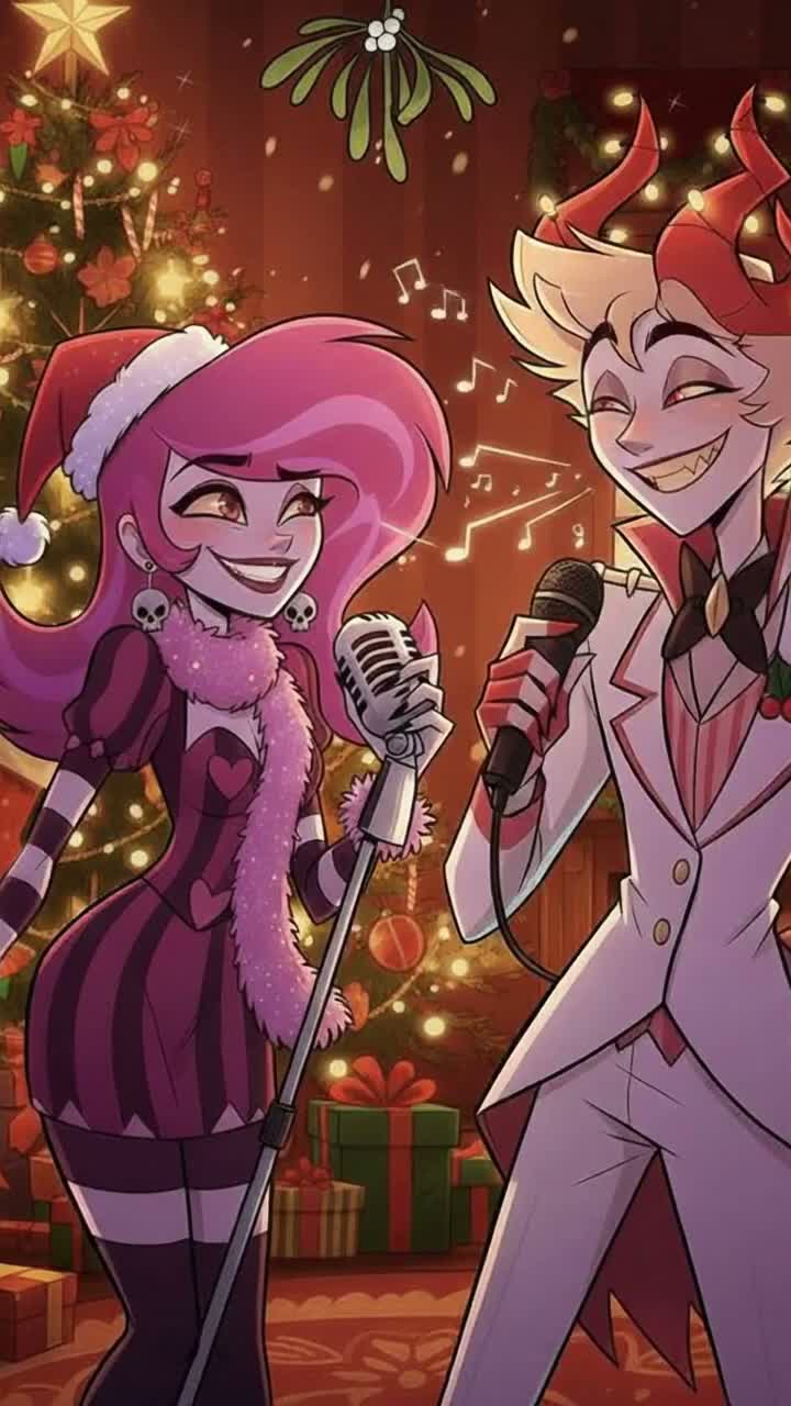 sleek, modern, and addictive, with a punchy, tight beat similar to high-end electro-pop or future-pop, Use shimmering synths, soft bells, warm pads, and crisp percussion to create a luxurious holiday atmosphere, The vocals should be a young male + young female duet with playful chemistry, inspired by the dynamic energy of Lucifer and Velvette from Hazbin Hotelโseductive, mischievous, charismatic, and stylish but still sweet, The melody should be instantly catchy with a smooth, flowing hook, layered harmonies, silky ad-libs, and a polished, bright chorus, Christmas night glamour, flirtation, magic, temptation, and winter sparkleโlike a festive cocktail party with an edge, clean, elegant, addictive, modern electro-holiday pop with harmonized vocals, a punchy beat, and a luxurious, enchanting mood