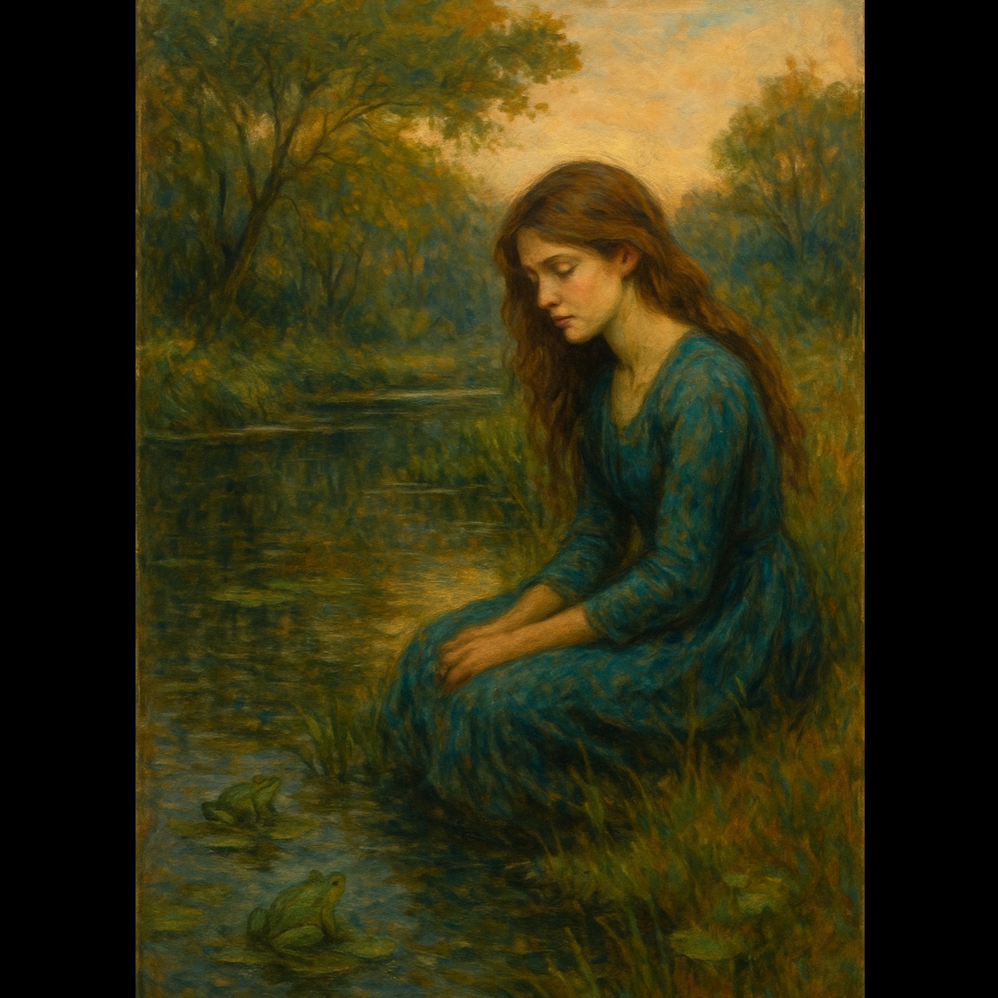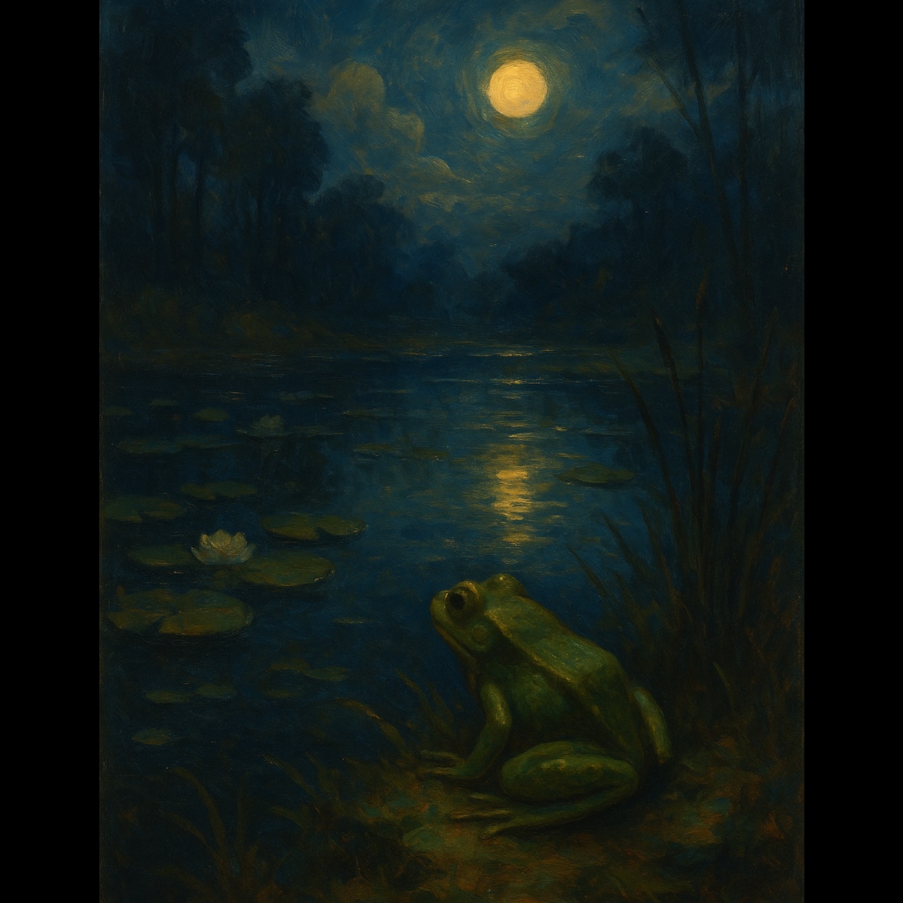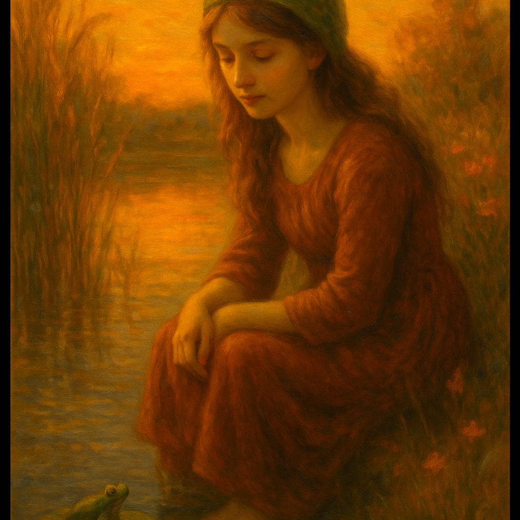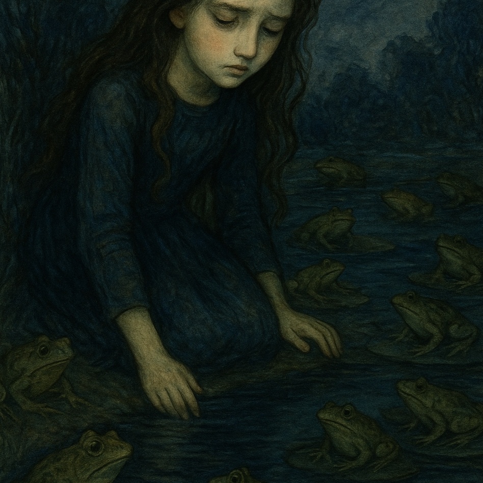 Moody and dreamy indie pop with cinematic retro vibes, Slow groove with sensual female vocals, layered harmonies, and poetic lyrics about love, longing, and nature, Soft electric guitar with surf-style reverb, minimalist drums, and vintage textures, The mood is hypnotic, mysterious, and romantic, set around a twilight pond and symbolic frogs, Inspired by classic Americana, noir love songs, and dreamy 60s aesthetics, Slow build, dynamic flow, and emotional delivery