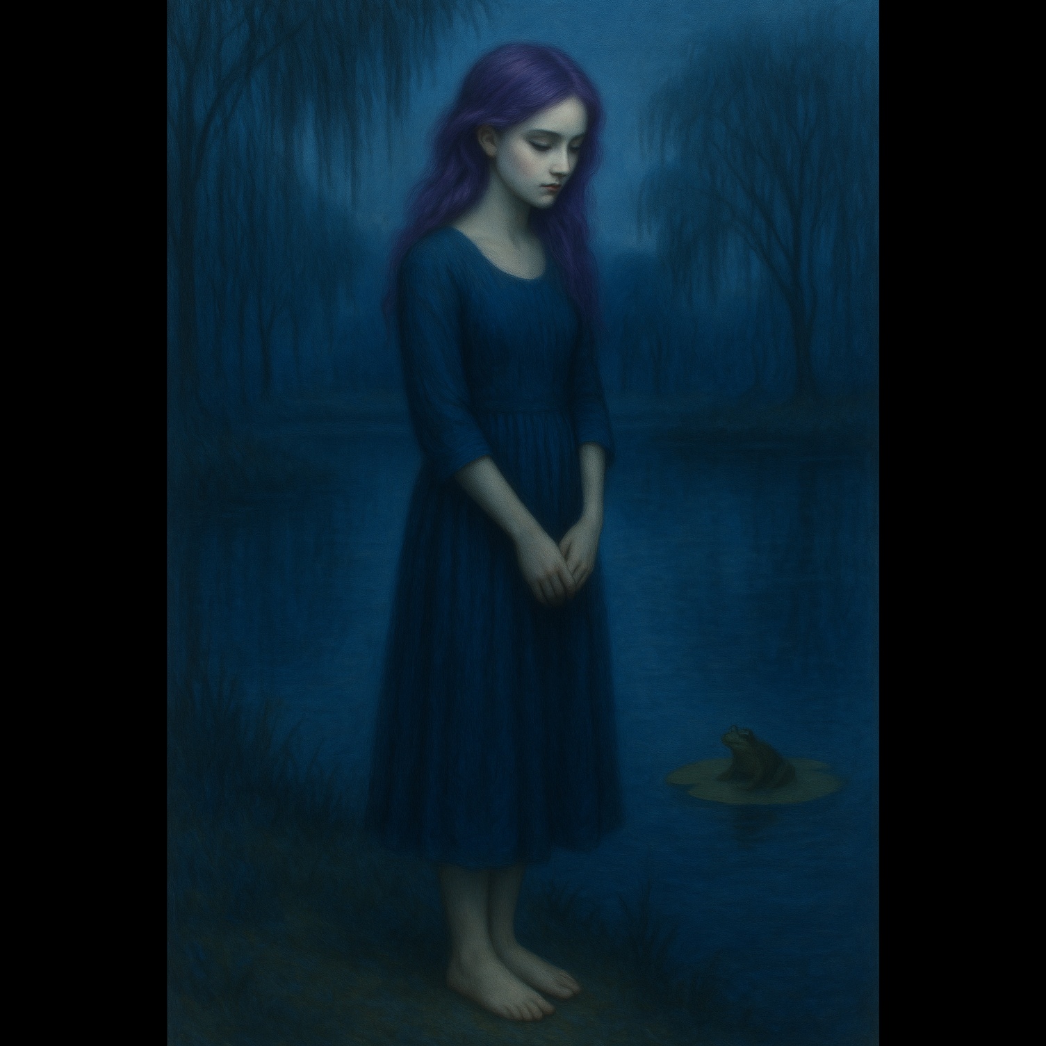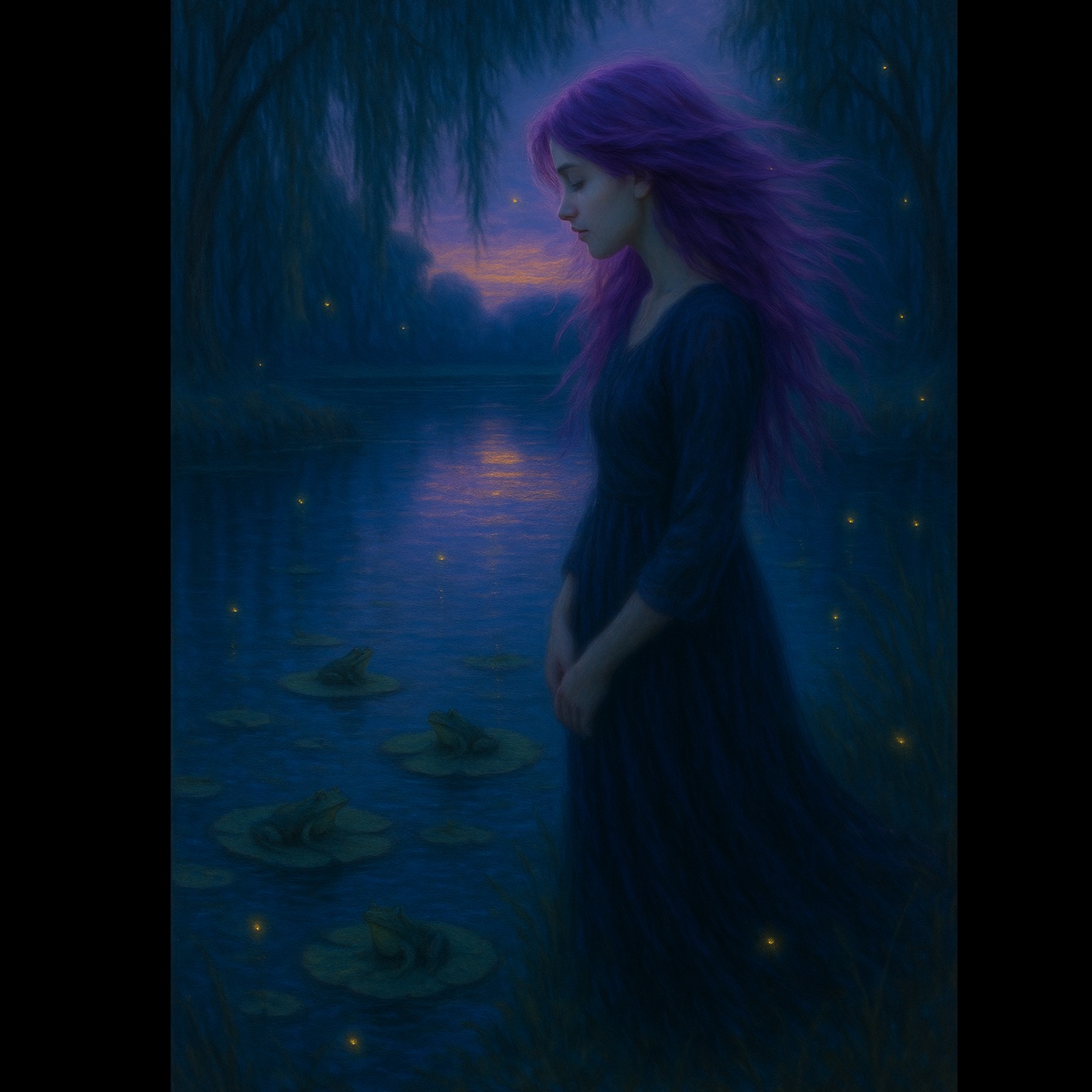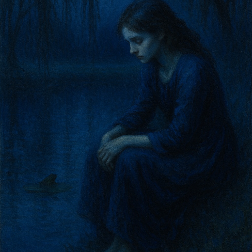 Moody and dreamy indie pop with cinematic retro vibes, Slow groove with sensual female vocals, layered harmonies, and poetic lyrics about love, longing, and nature, Soft electric guitar with surf-style reverb, minimalist drums, and vintage textures, The mood is hypnotic, mysterious, and romantic, set around a twilight pond and symbolic frogs, Inspired by classic Americana, noir love songs, and dreamy 60s aesthetics, Slow build, dynamic flow, and emotional delivery