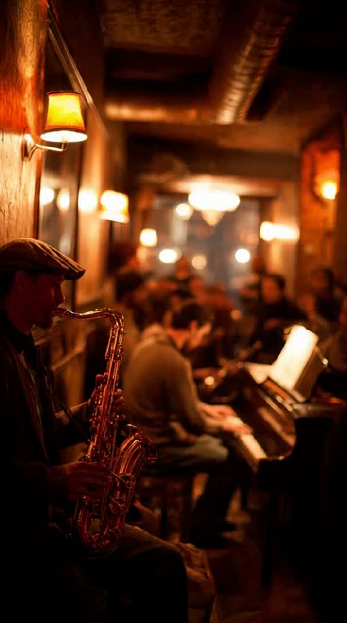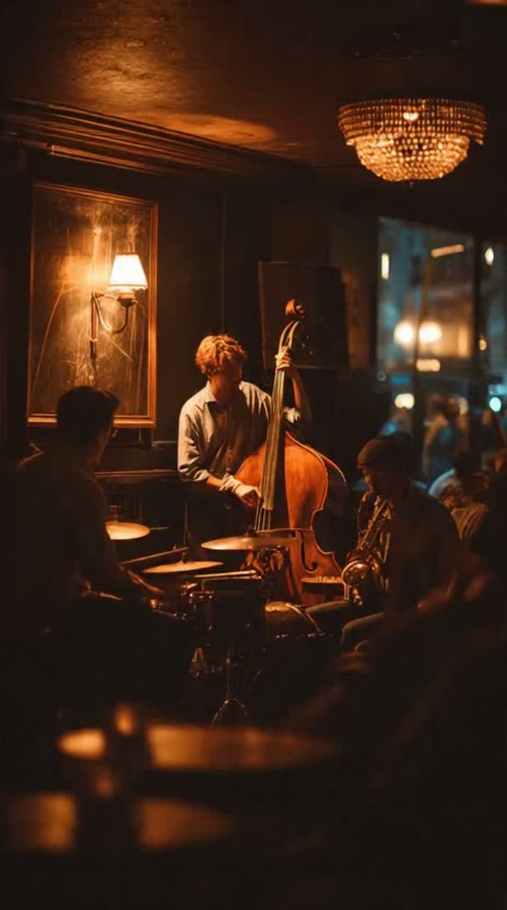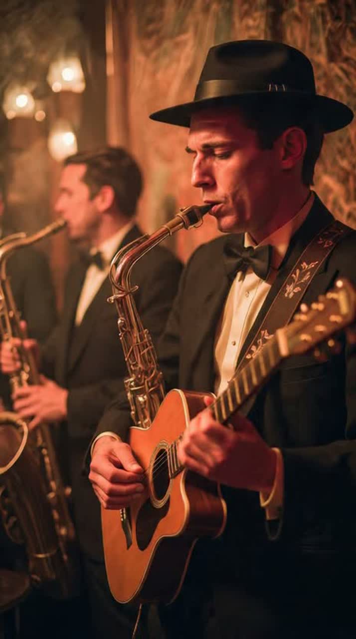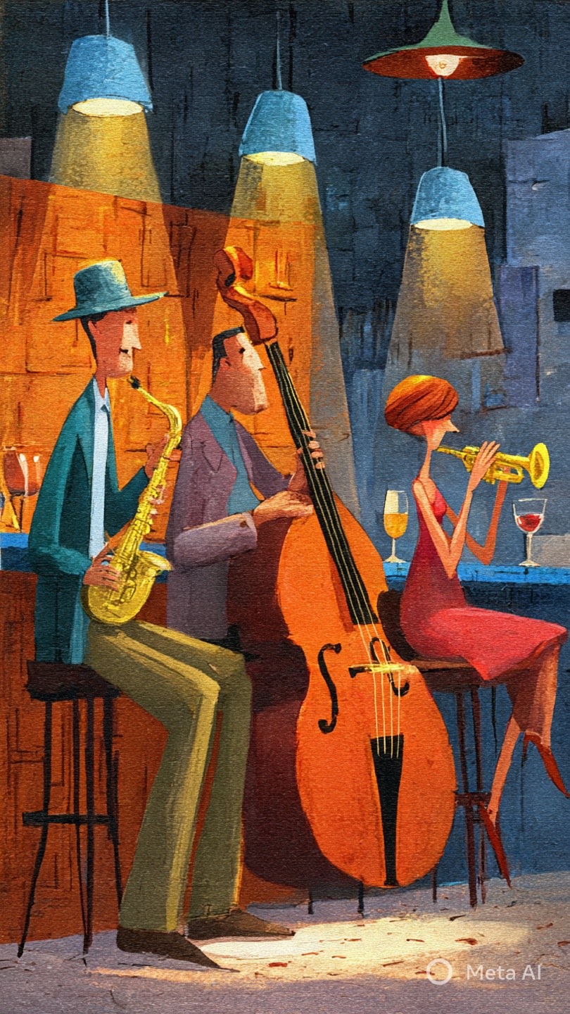 The track opens with upright bass and acoustic guitar, establishing a rhythmic, melodic groove, Trumpet introduces the main motif, then hands the lead to the sax, which develops the melody further, The bridge features an expressive sax solo, with subtle chordal support from guitar and bass