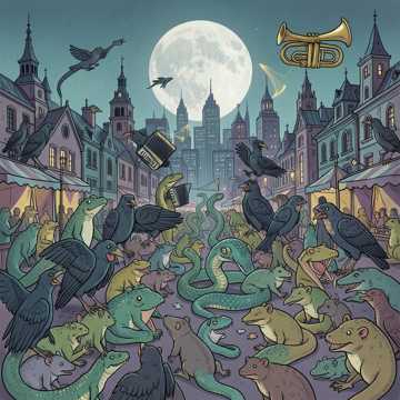 Balanced fusion of ska-punk, polka, and rap with animal sounds as rhythmic textures, BPM 140-160, Rhythm: hybrid — ska upstroke guitars offbeat, walking bass, polka 2/4 oompah beat (tuba on 1 and 3), and hip-hop influenced drum breaks, Accordion: cheerful runs, stabs, sometimes doubling brass, Brass: trumpet and trombone with ska stabs and polka fanfares, Harmonica: distorted with delay, Rap vocals: male, playful, rhythmic, with a storytelling flow — sometimes spoken, sometimes chanted, with call-response from instruments and animal sounds, Animal sounds: frog croaks, snake hisses, howls, hyena laughs, dog barks — used as rhythmic accents, drops, and comedic punctuation, Guitars: distorted power chords, clean upstroke for ska, Bass: deep, walking, alternating with tuba, Drums: ska backbeat, polka snare, hip-hop kicks and snares, Production: raw but clear, vocals upfront, brass and accordion prominent, animal sounds punchy, Mood: festive, rebellious, hilarious, urban, a carnival of beat