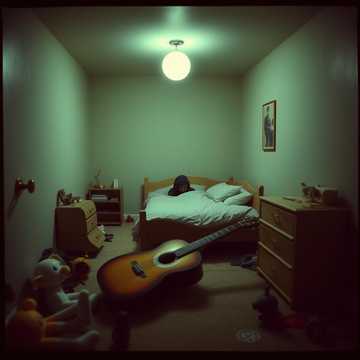 A raw acoustic lament, anchored by slow, tentative guitar plucks—each note uneven, bearing the rustic timbre of a weathered dumpster guitar, The arrangement is unadorned, leaving space for the intimate, imperfect voice of a child, with subtle fret buzz capturing every fragile, honest moment
