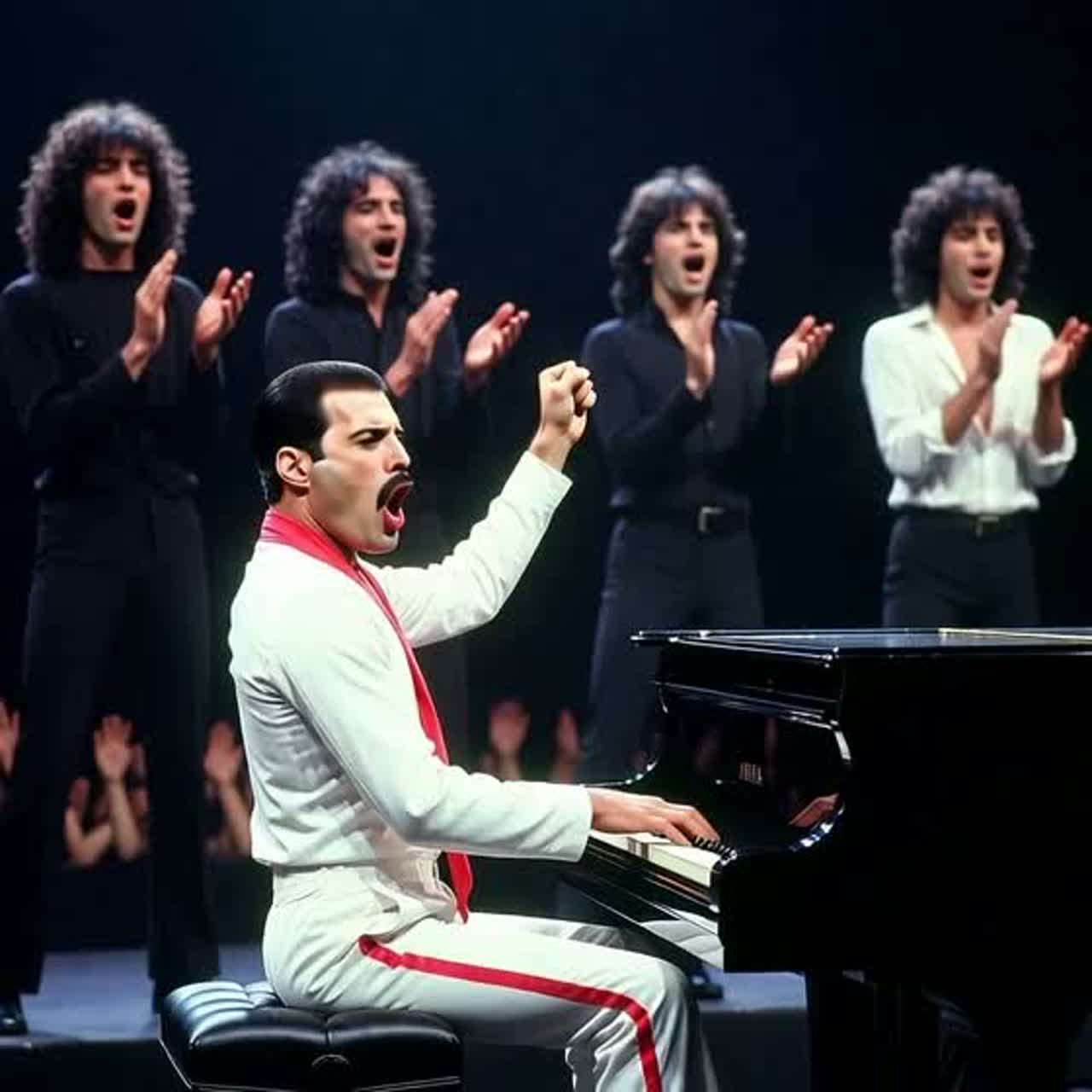 Solo piano, theatrical classical rock piano arrangement, grand piano with rich reverb, dramatic dynamic contrasts from soft to powerful, fast arpeggios and octaves, glissandos, expressive pedaling, Queen-style melodic and harmonic flair, emotional builds, no other instruments, pure acoustic piano only
