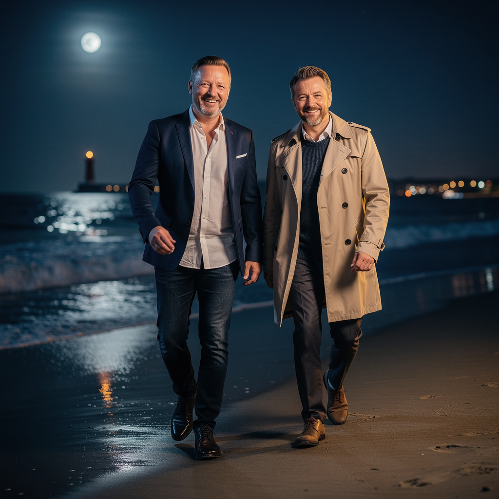 This is a German Schlager pop song with a moderate tempo and a major key, The instrumentation includes a prominent synth bass, a drum machine providing a standard pop beat, and various synthesized melodic elements, The lead vocals are male, delivered in a clear, slightly theatrical style, with occasional spoken word sections, The song features a call-and-response structure in some vocal parts, and a layered production with multiple vocal tracks during choruses, Production elements include reverb on vocals and a clean mix that emphasizes the melodic lines, The song structure follows a typical verse-chorus format with an instrumental break