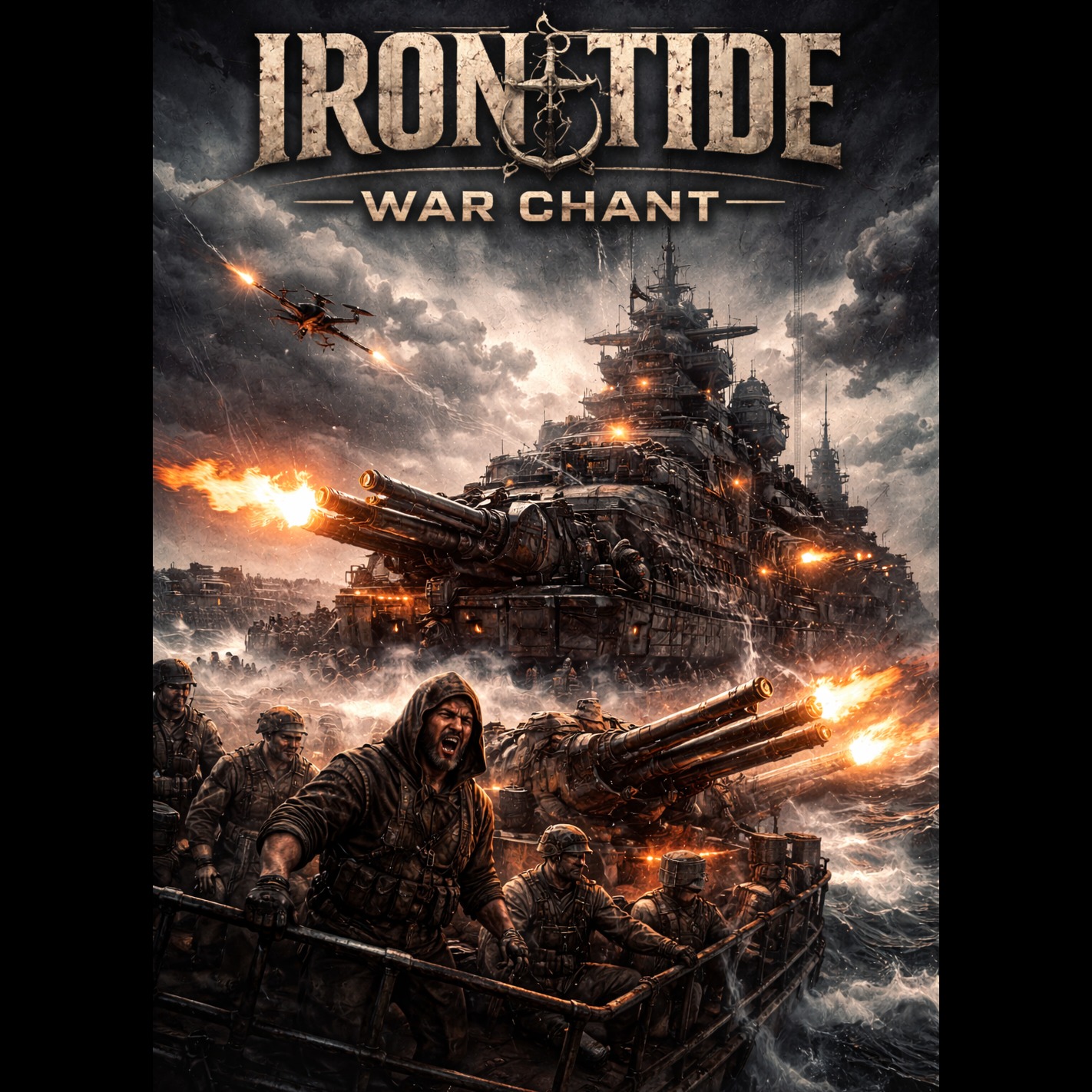 sea shanty mixed with cyberpunk rock, heavy industrial drums, distorted electric guitars, dark atmospheric synths, gritty male sailor chant vocals, epic naval battle atmosphere, stormy ocean, dystopian maritime warfare