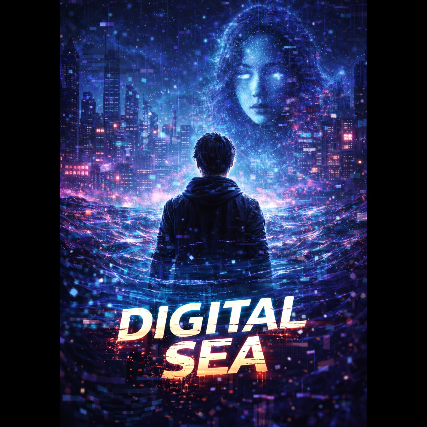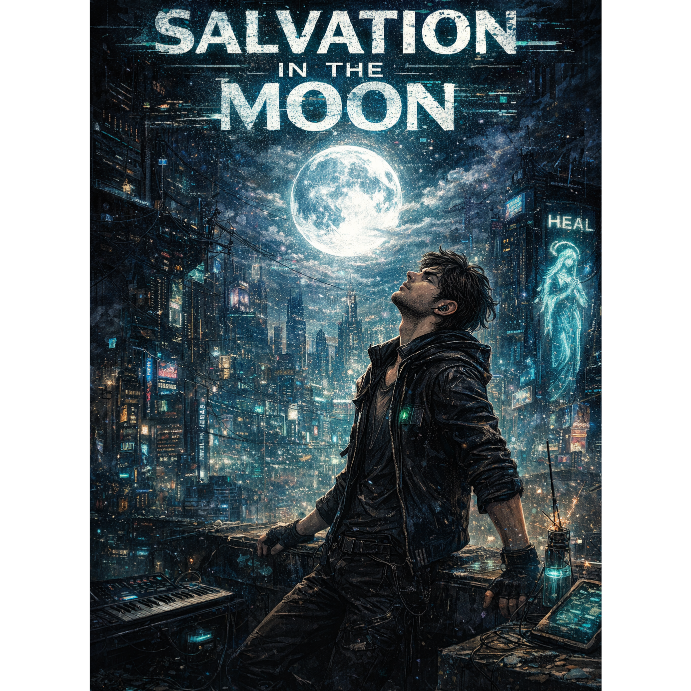 Cyberpunk Rock – dark synth pads, distorted electric guitars, deep electronic bass, glitch textures, atmospheric reverb, emotional male vocal, futuristic neon mood