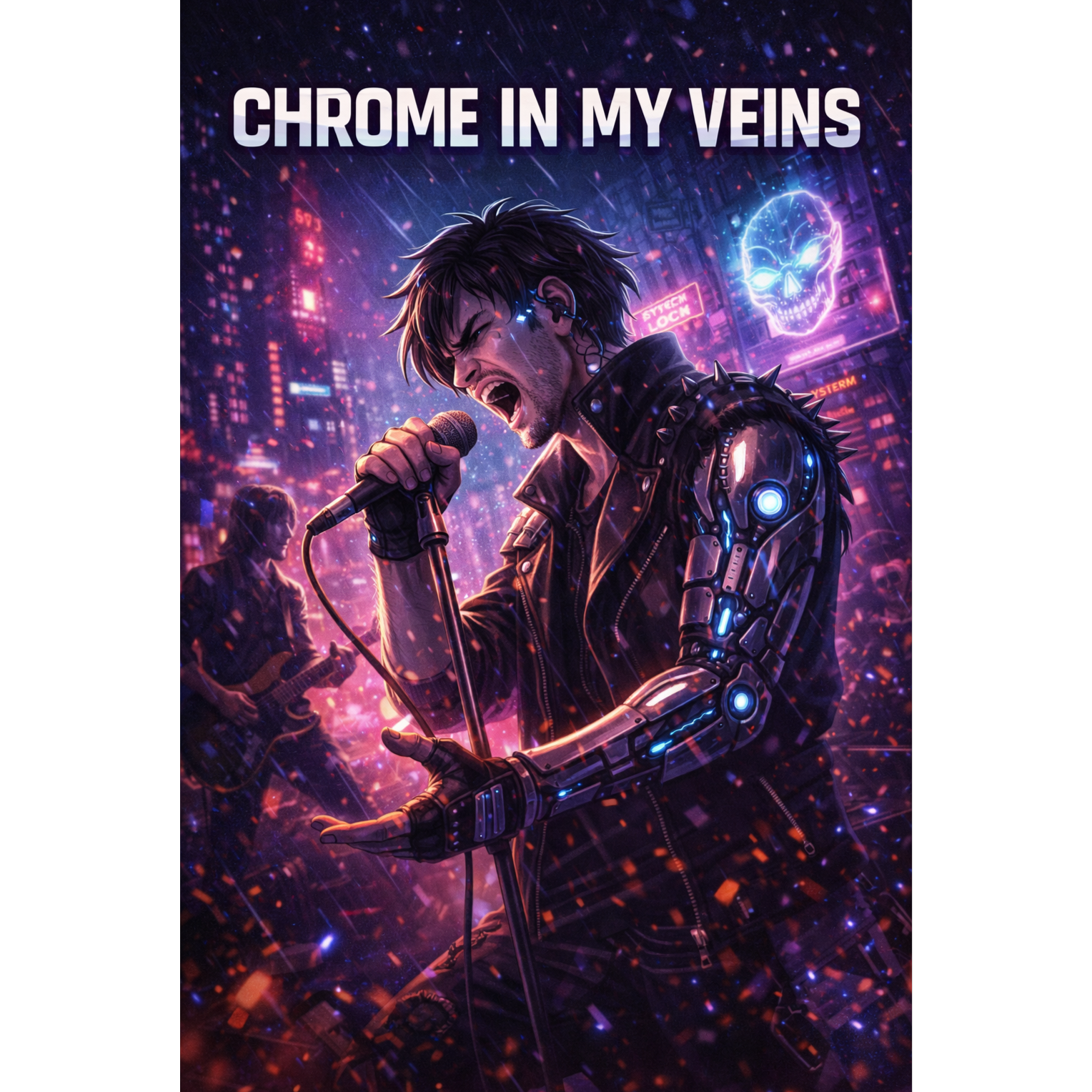 Cyberpunk rock with industrial influences, distorted electric guitars, driving rock drums, gritty male vocals, dark neon atmosphere, synth bass layered under live band instrumentation, rebellious futuristic tone, anthemic chorus, cinematic sci-fi energy, mid-to-fast tempo with aggressive swagger