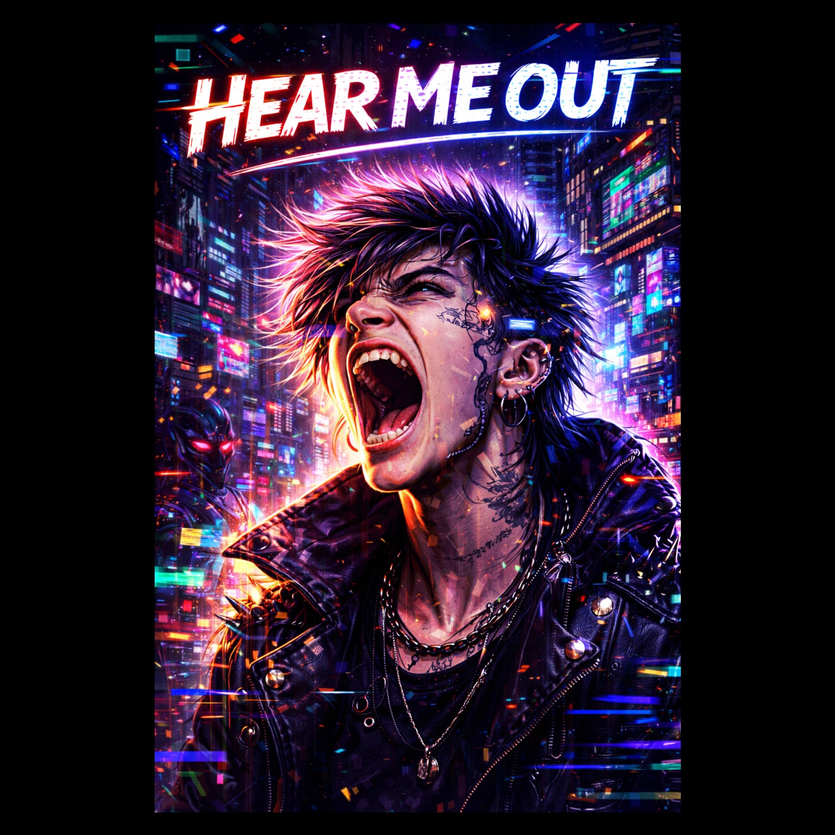 Cyberpunk rock rap – distorted industrial guitars, aggressive 808 bass, trap drums, dark cyberpunk synths, glitch FX, dystopian atmosphere, male rap verses with melodic rock chorus, immersive futuristic sound, 140 BPM
