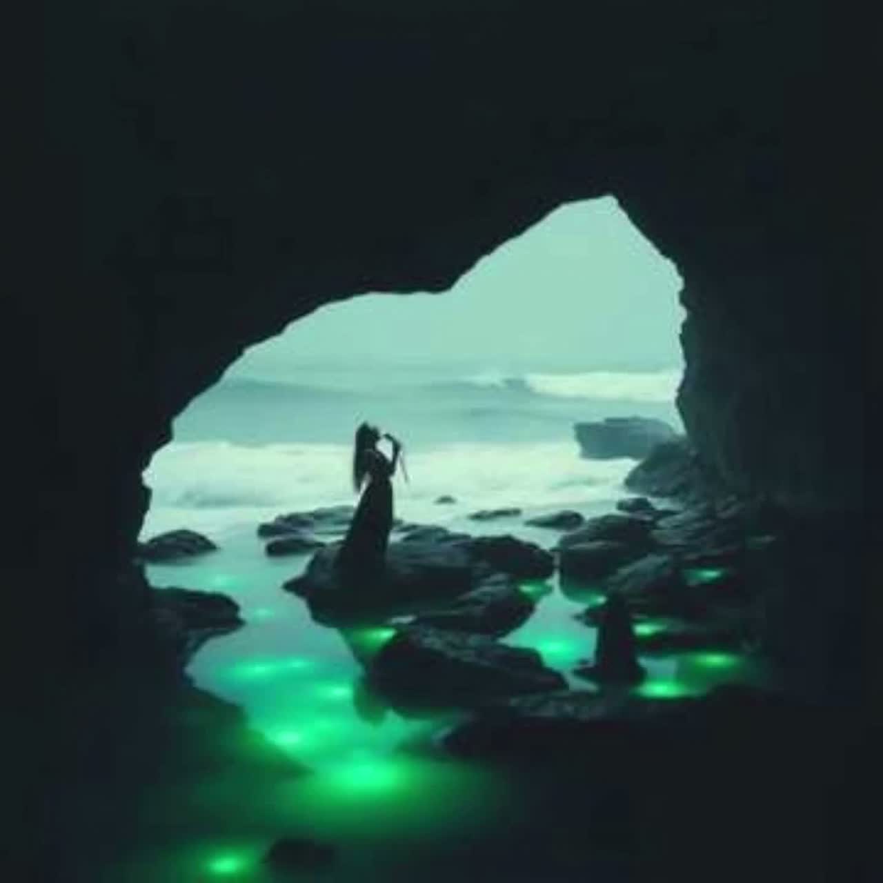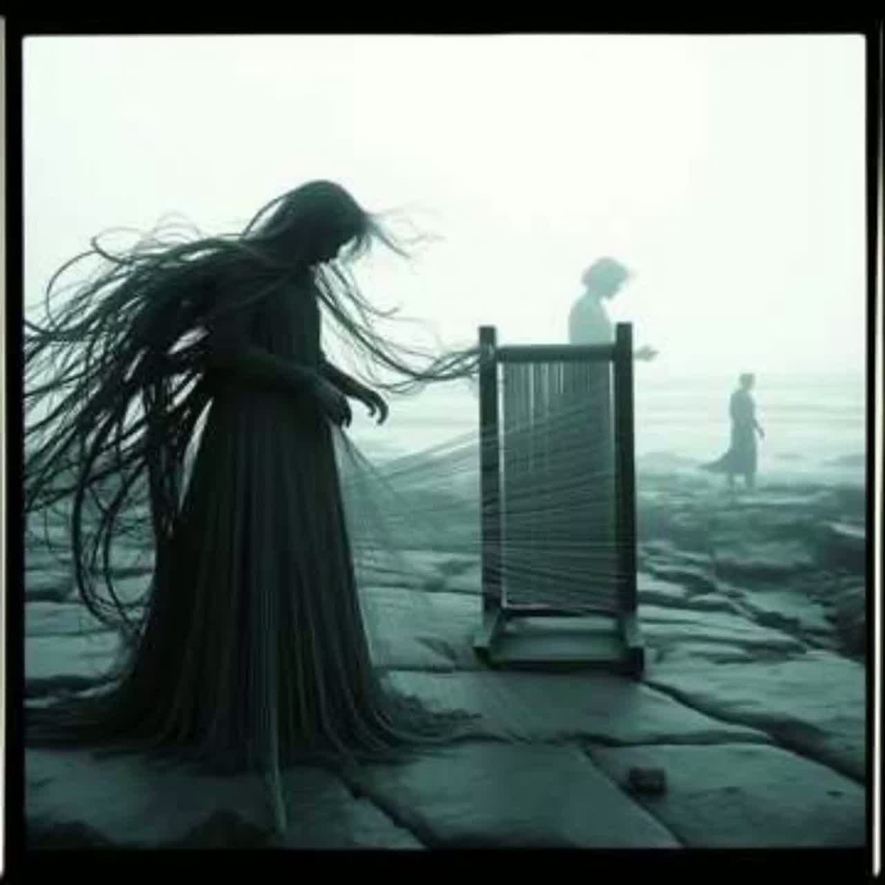 Ancient Nordic–Celtic transformation ritual tone, Modal base: Phrygian (the moment of fusion), Meter: slow 5/4 → drifting free-time as transformation begins, Instrumentation: deep frame drum, bowed lyre, long low drones, bone flute harmonics, submerged rumble textures, Atmosphere: crushing water weight, lower-register drones, faint metallic pressure-wine as the loom begins forming, Mood: dark, inevitable, awe-filled