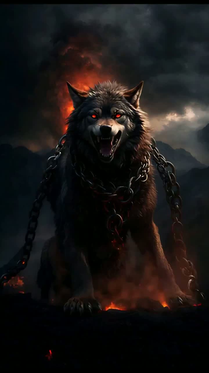 A chained wolf beneath a dying sun, blood on snow, gods trembling, twilight skies, prophetic sorrow, the calm before Ragnarรถk