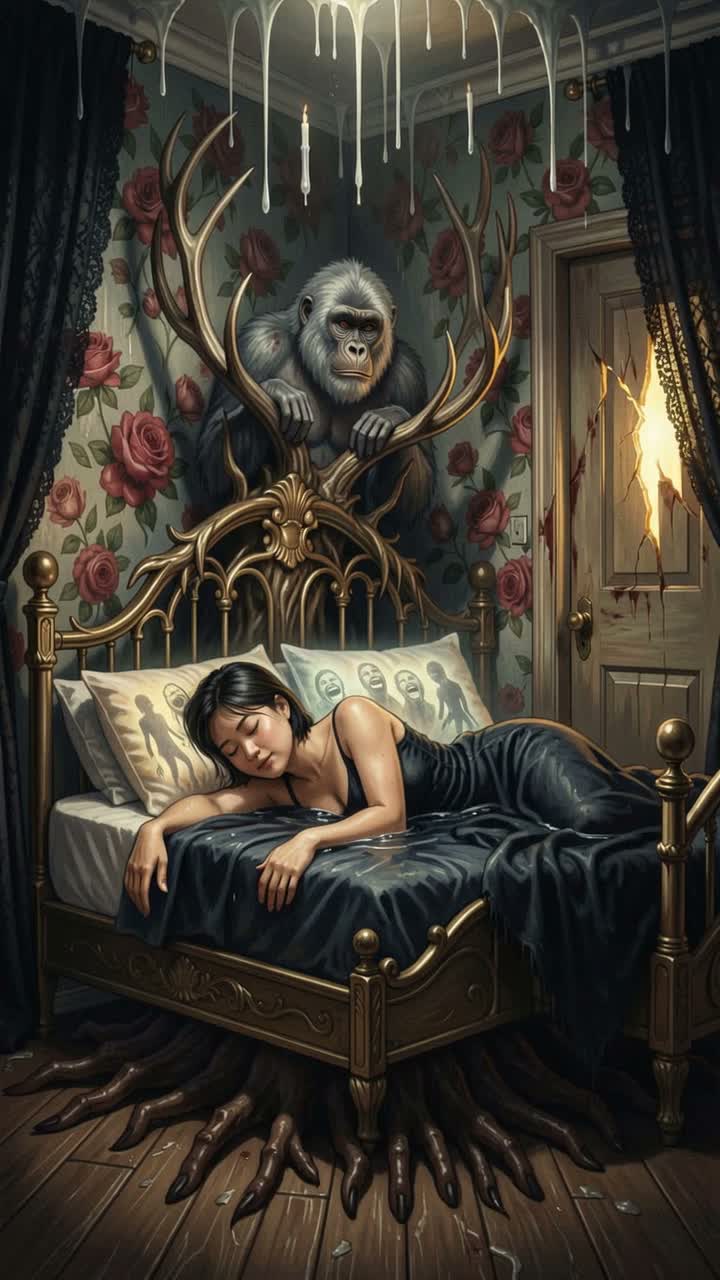 metal, Hybrid goth-to-death-metal-to-dream-pop journey; female vocals that move from hushed, close-mic croon with distant choirs into snarling, layered growls over downtuned guitars and double-kick surges, then bloom into bright, airy melody with clean arpeggiated guitars and warm bass; dynamics swell from lullaby softness to chaotic climax, then resolve in a shimmery, uplifting outro; subtle synth pads glue sections together, slow, sleep, soft, death metal