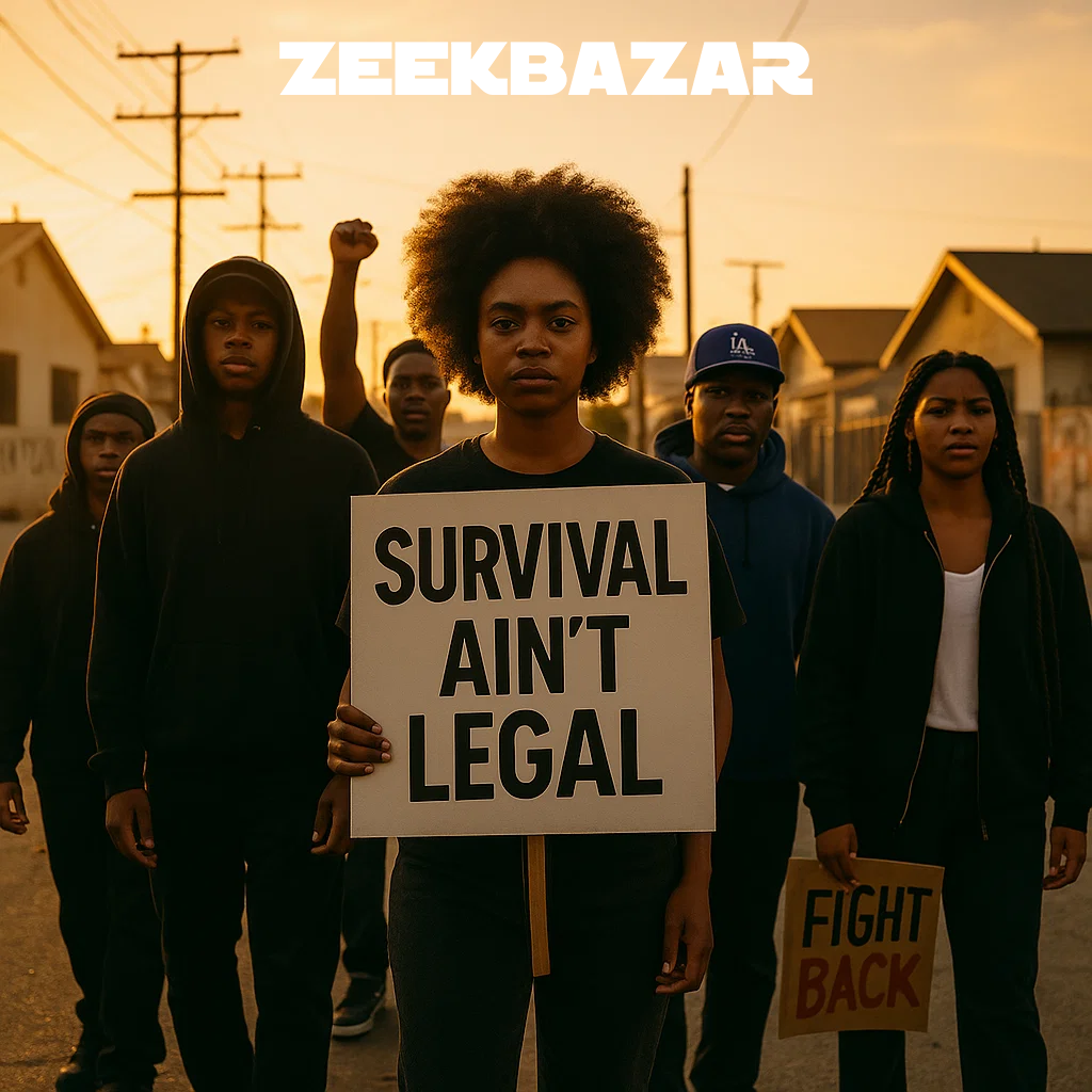 Raw and aggressive West Coast street rap track at 100 BPM, built around hard-hitting drum machine patterns, piercing snares, deep 808 bass, and minimalist funk samples, The instrumental must carry a menacing, no-compromise tone with police sirens, vinyl hiss, and turntable scratches as textural elements, Vocals: male, shouted and delivered with raw conviction, Flow should be fast, confrontational, and filled with street-coded language from South Central LA, The energy is militant and unfiltered — meant to feel like a warning, a threat, and a declaration of presence