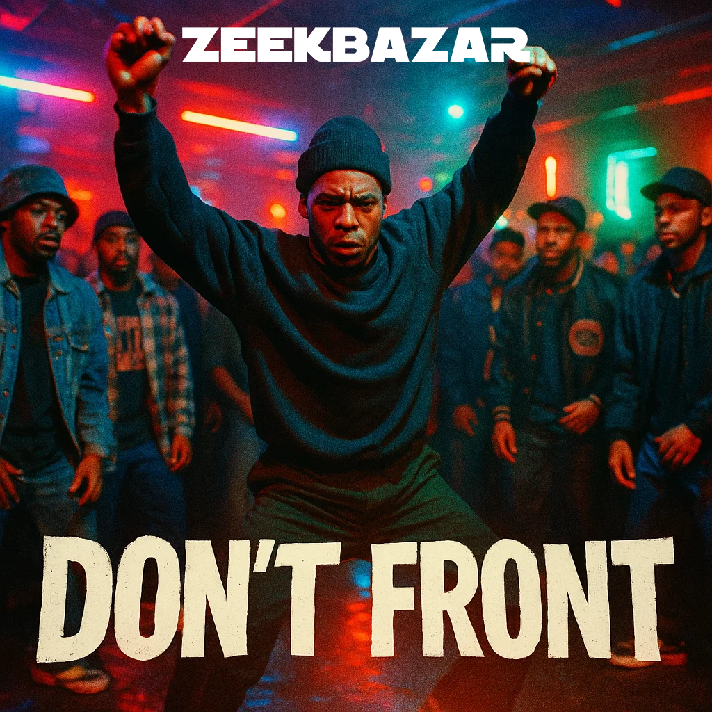 Hard-hitting 90s-style hip-hop anthem titled “Hands Up, Don’t Front, ” with aggressive delivery, heavy breakbeats, and punchy horn stabs, Male vocal with rowdy, nasal tone and hypeman-style ad libs, Beat driven by crunchy sampled drums, chopped brass loops, distorted bassline, and call-and-response energy, Tempo around 107 BPM in 4/4, The vibe must feel like a wild crowd chant — physical, chaotic, and raw, Theme: You raise your hands not to surrender, but to prove you belong — or get out of the circle
