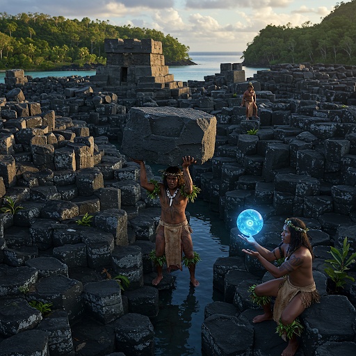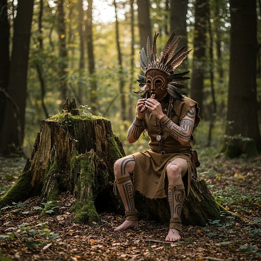 Wooden flute, Percussion drums, taiko, pahu, cinematic, tribal-metal fusion, ancient Pacific island, Heavy-Djent guitar riffs, low-tuned, polyrhythmic, ritualistic, atmospheric, 90-100 BPM