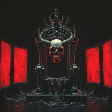 Rage-fueled brutal, black/thrash/doom/groove metal with double kick carnage, syncopated riffs, and feral deep guttural shouts, 210+ BPM, tuned drop C, Heavy emphasis on rhythmic chugging and crowd-double-kick drums, breakdown energy, Themes of contempt for digital delusion and societal decay