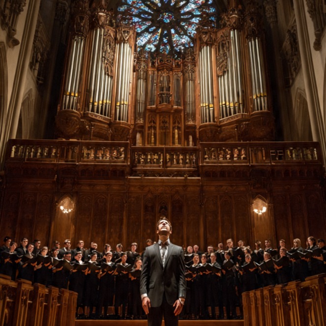 A grand solo pipe organ piece unfolds with stately ascending chords and ornate melodic lines, Flourishes of rapid arpeggios and powerful pedal tones alternate with tender, lyrical passages, evoking a cathedral setting and traditional classical architecture in texture and dynamics