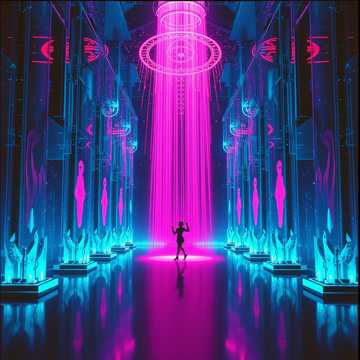 Bass male narrator voice + airy alto female vocals, Heavy sub-bass, deep wobble drops, glitch textures, and futuristic drum-and-bass energy, BPM ~200, Dark, cinematic, atmospheric, immersive, rave-ready, Ethereal pads, neon synths, subtle choirs, and shimmering reverb, The groove feels hypnotic and uplifting while still intense — dancers let worries melt away and surrender to the beat, Big tension builds with silence cuts before massive bass drops, Contrast: soft spiritual vocals vs heavy mechanical bass, Mood: futuristic, dreamy, epic, emotional, techno-driven, fast, energetic, transcendental, Think cyber-temple rave at midnight, hypnotic