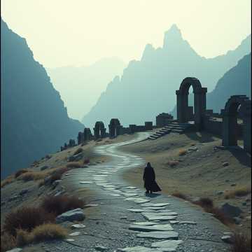 Soft acoustic guitar or lute with deep, echoing hand drums, A low male vocal or bard-like tone reciting the verses almost as spoken word, Background wind or faint choral hum to evoke the mountains and loss, Mid Build (March phase):