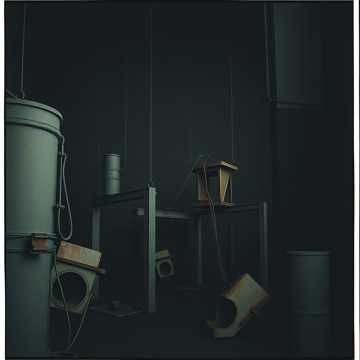 Industrial electronic track with mechanical pulse patterns emulating breath, layered over deep, saturated synth bass, Filtered white noise rises and falls, synchronized to low-end rhythms, Metallic scrapes punctuate textured soundscapes, while warped, echoed voices swirl hauntingly in the background