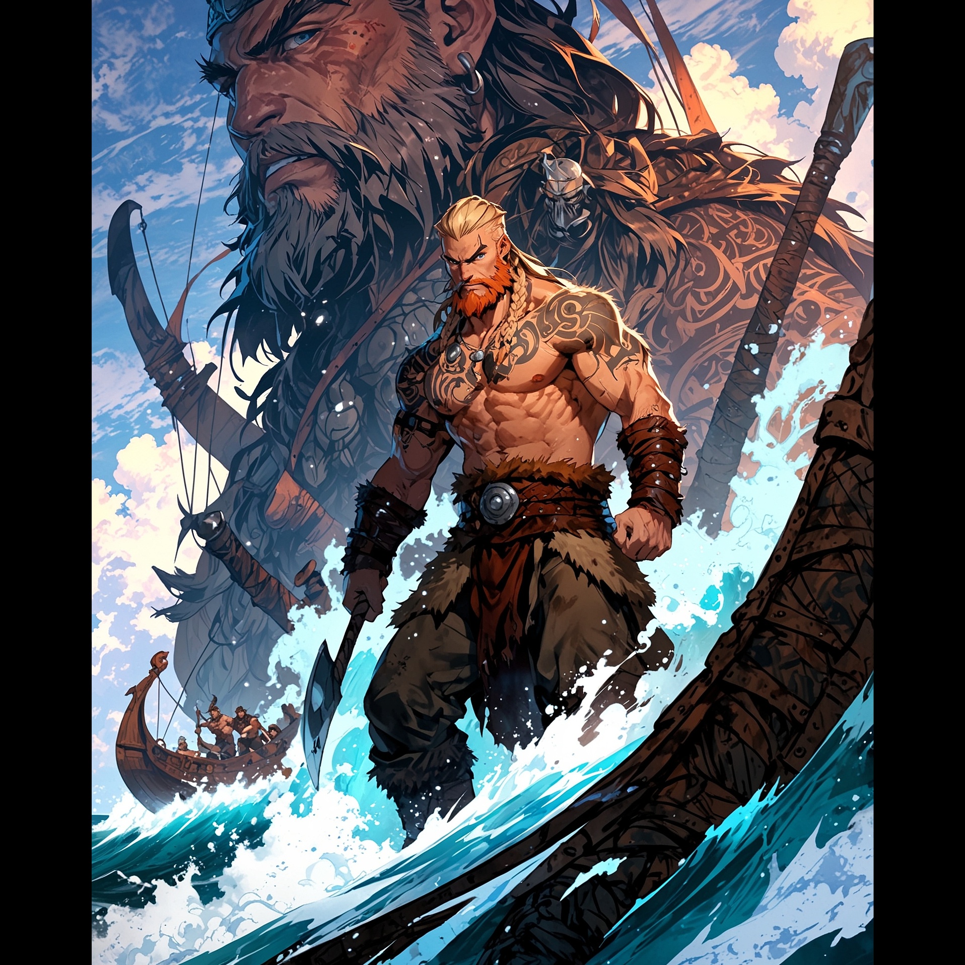 Celtic epic saga, A hoarse male warrior voice sings of Viking trials — war, survival, and tribal pride, Vocal-led anthem with throat tones, rhythmic chanting, humming, and occasional yodel-like voice breaks, Backed by deep war drums, synchronized foot stomps, and the raw sound of wooden tankards slammed against tables, Everything echoes like a battle cry in a stone hall, Gritty, primal, and alive