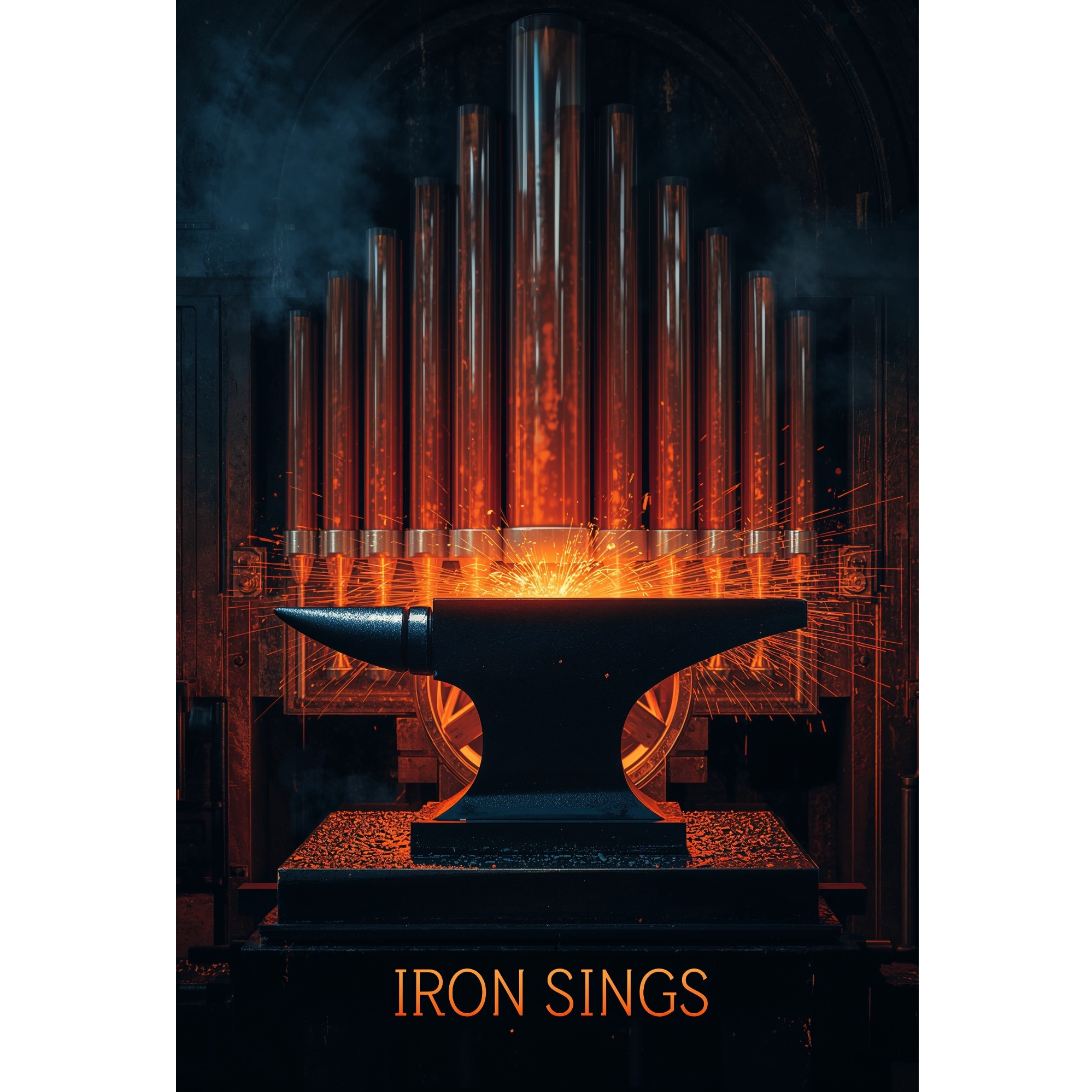 Forge-anthem: ritual folk × industrial groove (96 BPM, 4/4 with light triplet feel), Percussion: the shop—anvil as kit (face=low, peen=high), horn taps for fills; tongs clack offbeats; boot stomps on stone; beech block ghosts, Steam/Sizzle: forge blower bed; short steam bursts; quench hiss as risers; water-bucket slap on 2&4, Grinder: wet wheel whine + grit as pre-chorus build and mid break; add spark-noise hits, Low end: sine sub glued to anvil hits; soft tuba/baritone-horn swells, Harmony/Melody: hurdy-gurdy drone (buzzing chien), reed harmonium pads, hammered dulcimer sparks, nyckelharpa licks; optional modular-saw lift, Feature: glass-tube pyrophone under choruses (breathy, hollow, Em pentatonic), tucked below vocal, Vocals: earthy female alto/contralto (G3–C5), close, chest-led; verses half-spoken work-chant; chorus tight unison 3–5, no shouts, Mix: dry anvil mono center; stone-hall room low; sidechain drones/pads to blows; warm mids, round sub