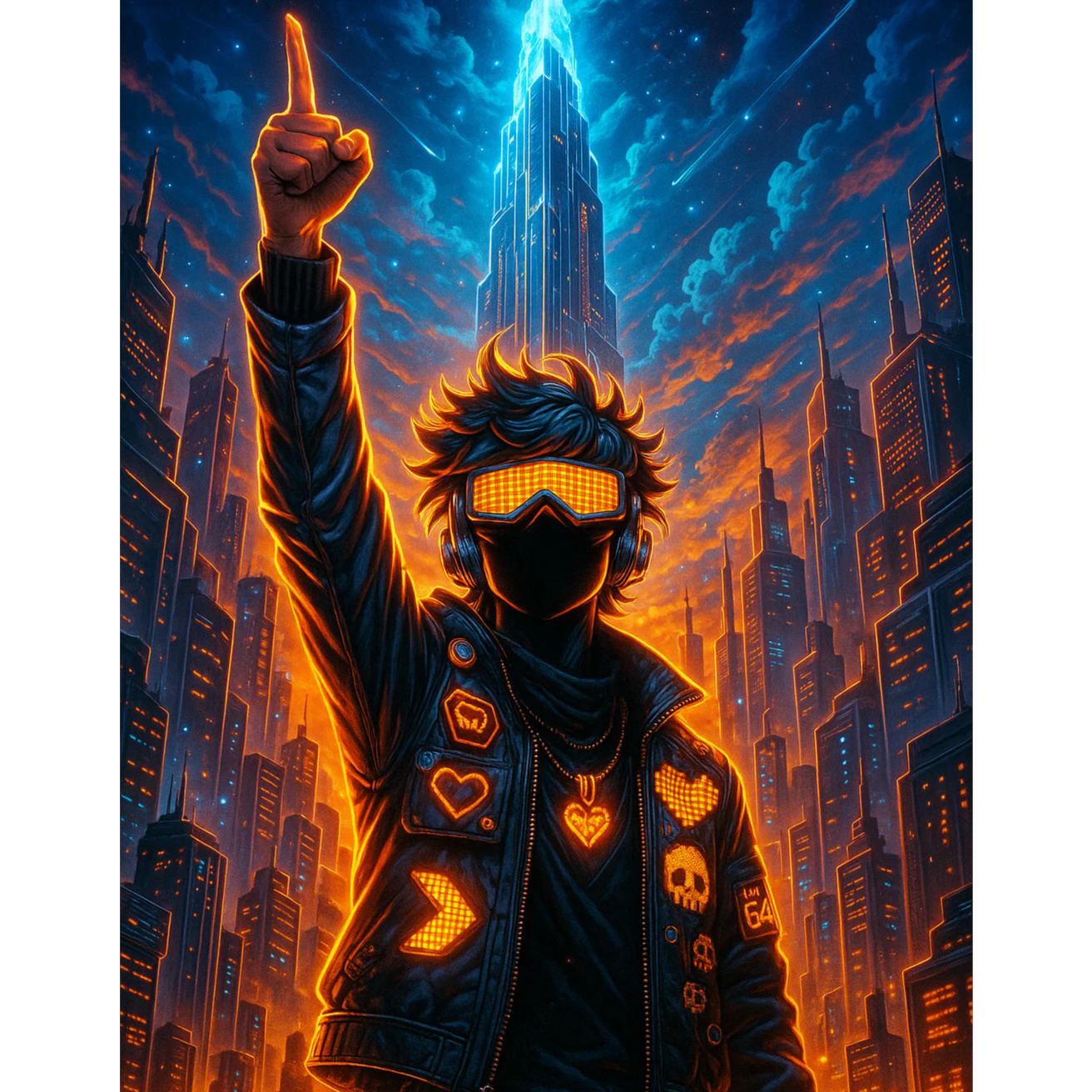Epic Pop Rock with uplifting, groovy energy, Chiptune melodies, New Wave synths, heroic and adventurous, cinematic, motivational, vibrant, breakbeat-driven, energetic drums, soaring guitars, retro 8-bit elements, layered synths, dynamic, bold, epic atmosphere