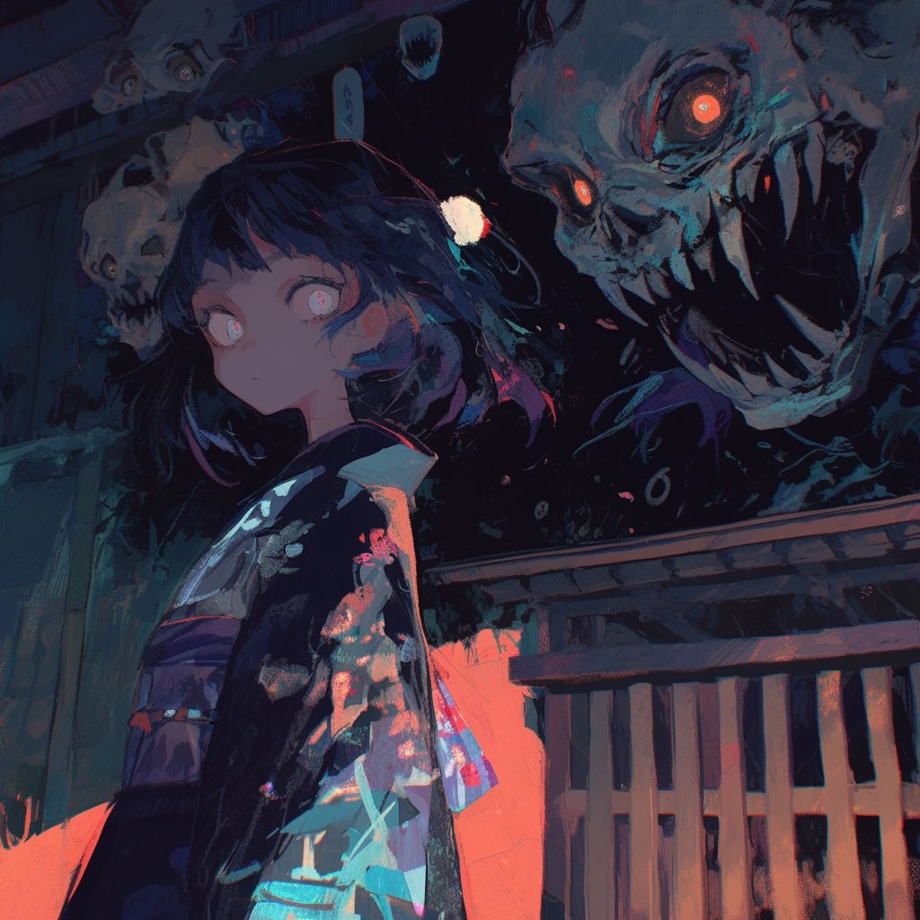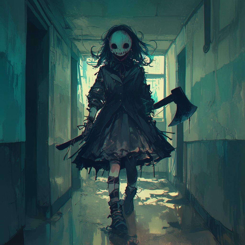 cyberpunk, techno, j-pop, metal, post-hardcore, cute voiced female singer, funk, eerie, scary feel