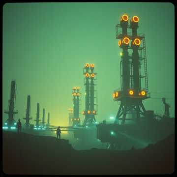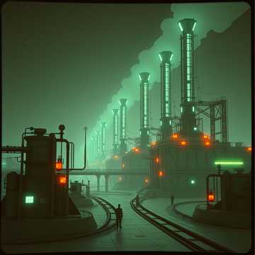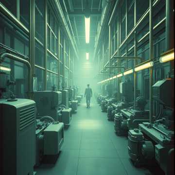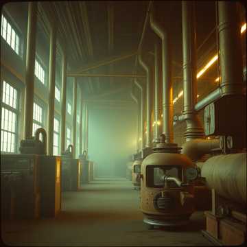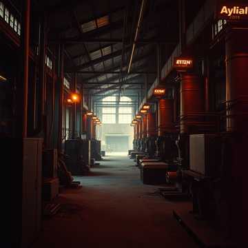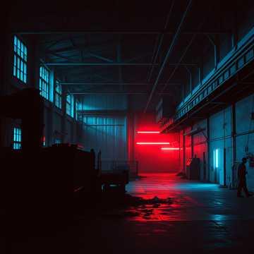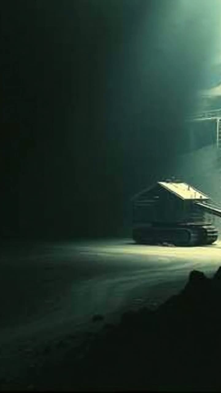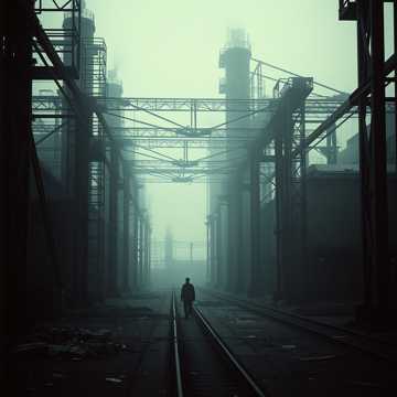 Instrumental cinematic industrial horror, Deep, grinding metal-saw textures dragging across steel, Triangular-wave synths with heavy bit-crush and digital crunch, Massive subterranean drones pulsing like buried machinery waking up, Mechanical impacts, echoing gear clanks, rebar scraping, and heavy hydraulic groans, Slow, oppressive rhythm with unstable tempo shifts, Cavernous reverb, long metallic echoes, and ghostly stereo movement, Distorted synth swells, glitch bursts, and low-frequency rumble, Tension-building crescendos, sudden drops into near-silence, then explosive mechanical surges, No vocals, No melody, Pure industrial dread with cinematic scope