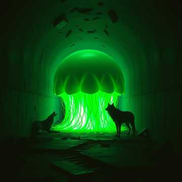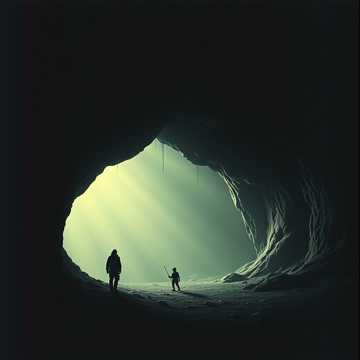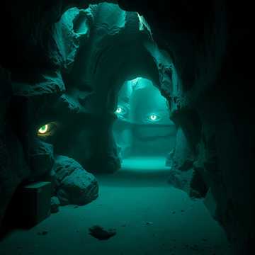 Deep cavern ambience with massive echo and hollow stone resonance, Add distant, muffled metal textures — low grinding, faint metallic groans, and slow mechanical pulses, Increase glitch elements: digital flickers, corrupted signal bursts, stuttering frequency drops, and warped modulation sweeps, Layer dense, eerie whispers drifting in stereo—alien, fragmented, overlapping, like psychic signals bleeding in from another dimension, Include soft monk-like chant drones under the mix, warped and pitch-bent to feel unnatural, Overall mood is ancient, biomechanical, and hallucinatory—sci-fi dread inside a living cavern of watching eyes