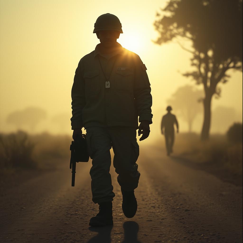 "disciplined, cold, intense, restrained emotion, realistic military tone"