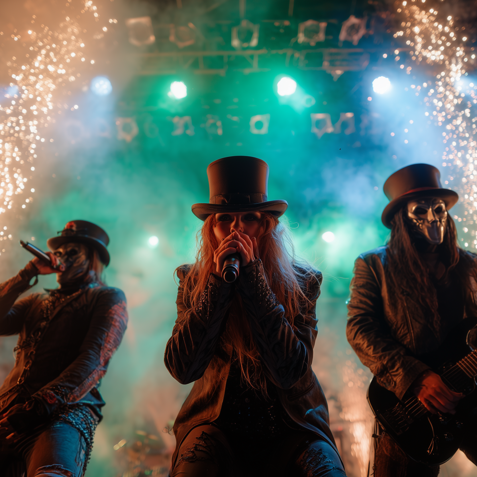 The track opens with a grand Gothic Victorian ballroom orchestral motif—lush strings, harp, and harpsichord—layered with haunting choir, Electric guitars, driving double-kick drums, and soaring synths surge in for the verse, fusing Gothic Metal allure, Symphonic Metal grandeur, and Power Metal energy, Majestic brass and choral swells amplify the masquerade atmosphere in the chorus, with tempo shifts and intricate guitar solos, The bridge offers a dramatic orchestral interlude before a climactic, theatrical finish blending all textures