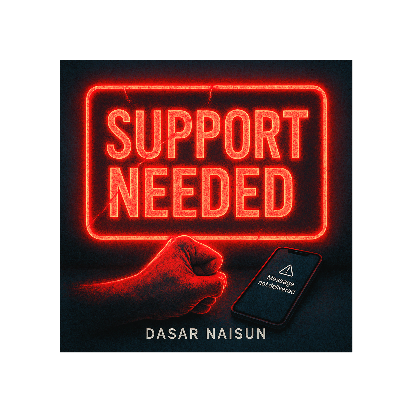 Cinematic metalcore with atmospheric intro and massive breakdowns, Begin with distorted radio voice saying “Message not delivered… Support needed…” fading into deep sub-bass and glitch noise, Verses: tense, dark male vocal over palm-muted guitars, cinematic pads, tribal drums, Pre-chorus: build-up with toms and rising synth, Chorus: explosive, huge guitars, epic industrial drums, layered vocals mixing melodic singing and desperate screams, Bridge: haunting, broken vocal over clean guitar and eerie synth, then eruption into a heavy breakdown with double kick drums and distorted guitars, Final chorus: stadium-wide, wall of sound, emotional and raw, Outro: glitch echoes and fading whispers “Support needed”, No autotune, raw vocal delivery