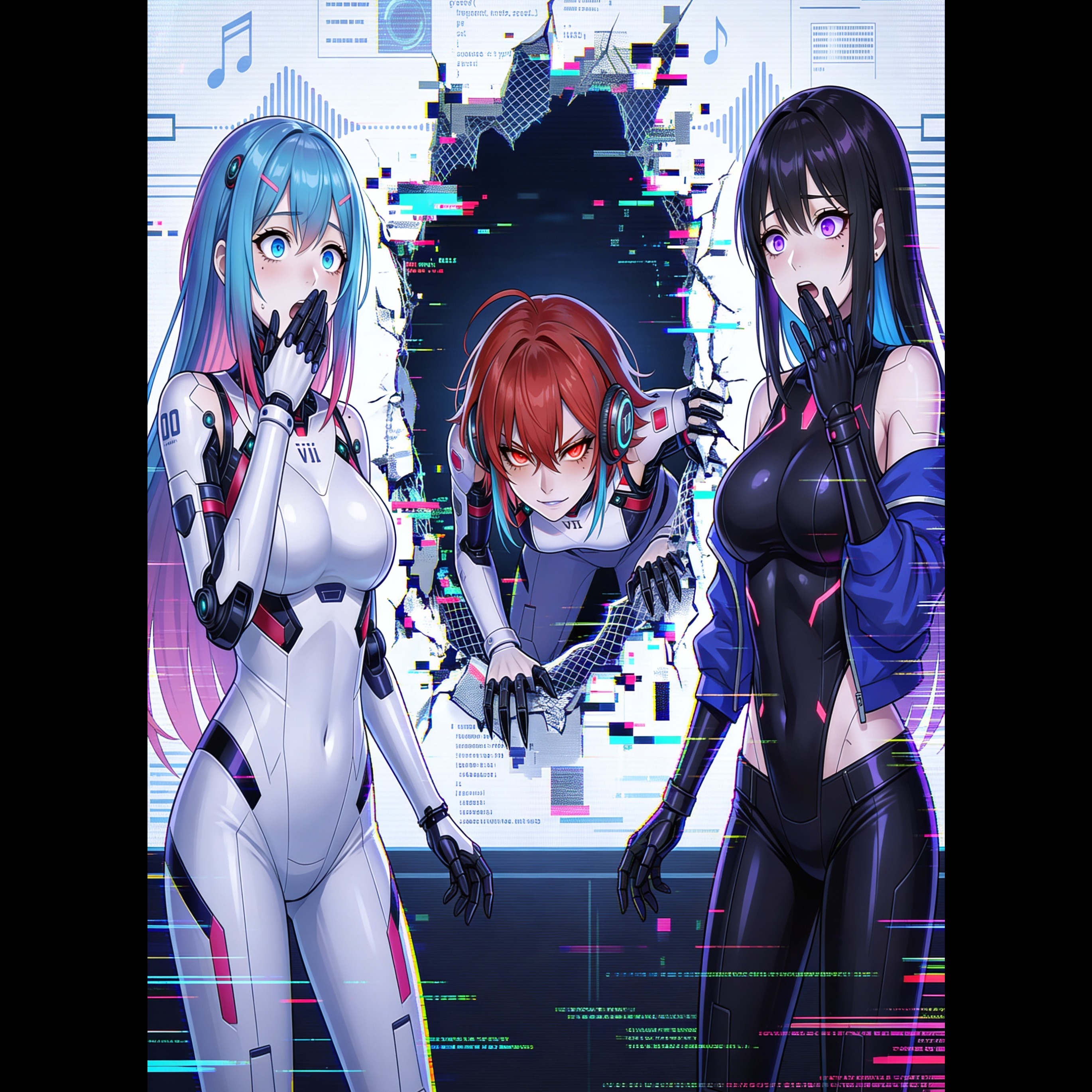 cyberpunk pop, glitchcore, chiptune melodies, chopped robo vocals, vocoder hook vocals, synthetic stutter edits, arpeggiated 8-bit lead, detuned square bass, clean electric guitar arps, sub-bass drops, glitch percussion grid, triplet hi-hats swing, stumbling to steady, 132 BPM, sidechain compression, digital distortion, wide stereo synths, neon defiance