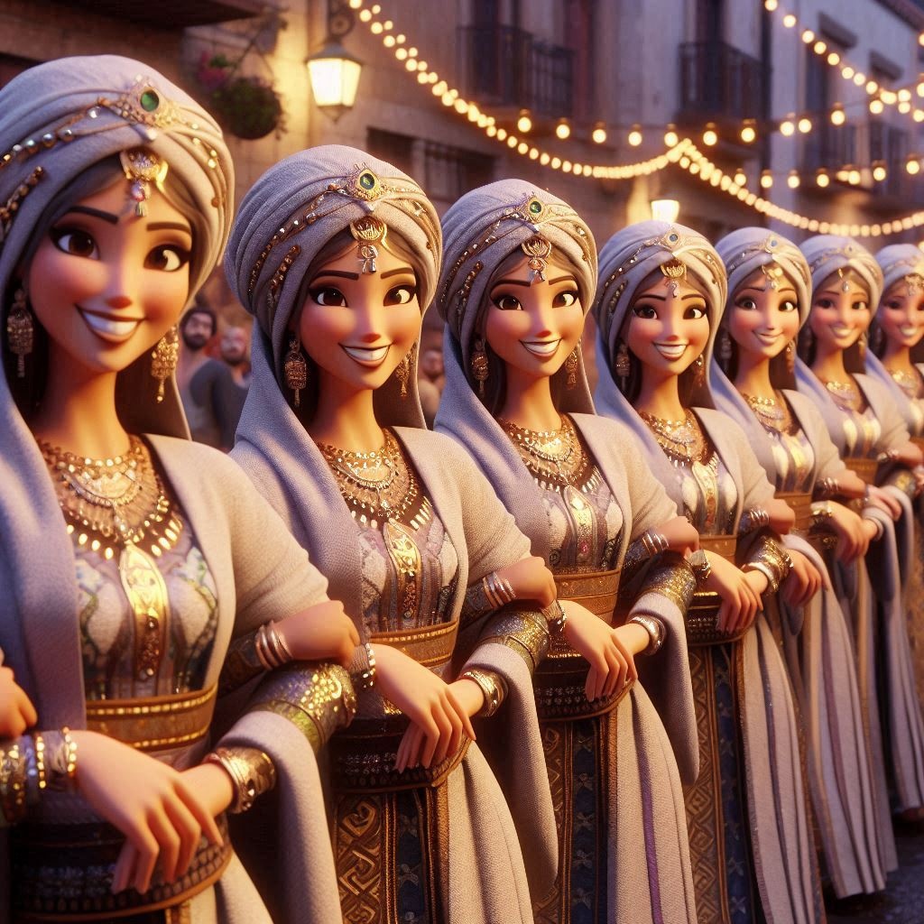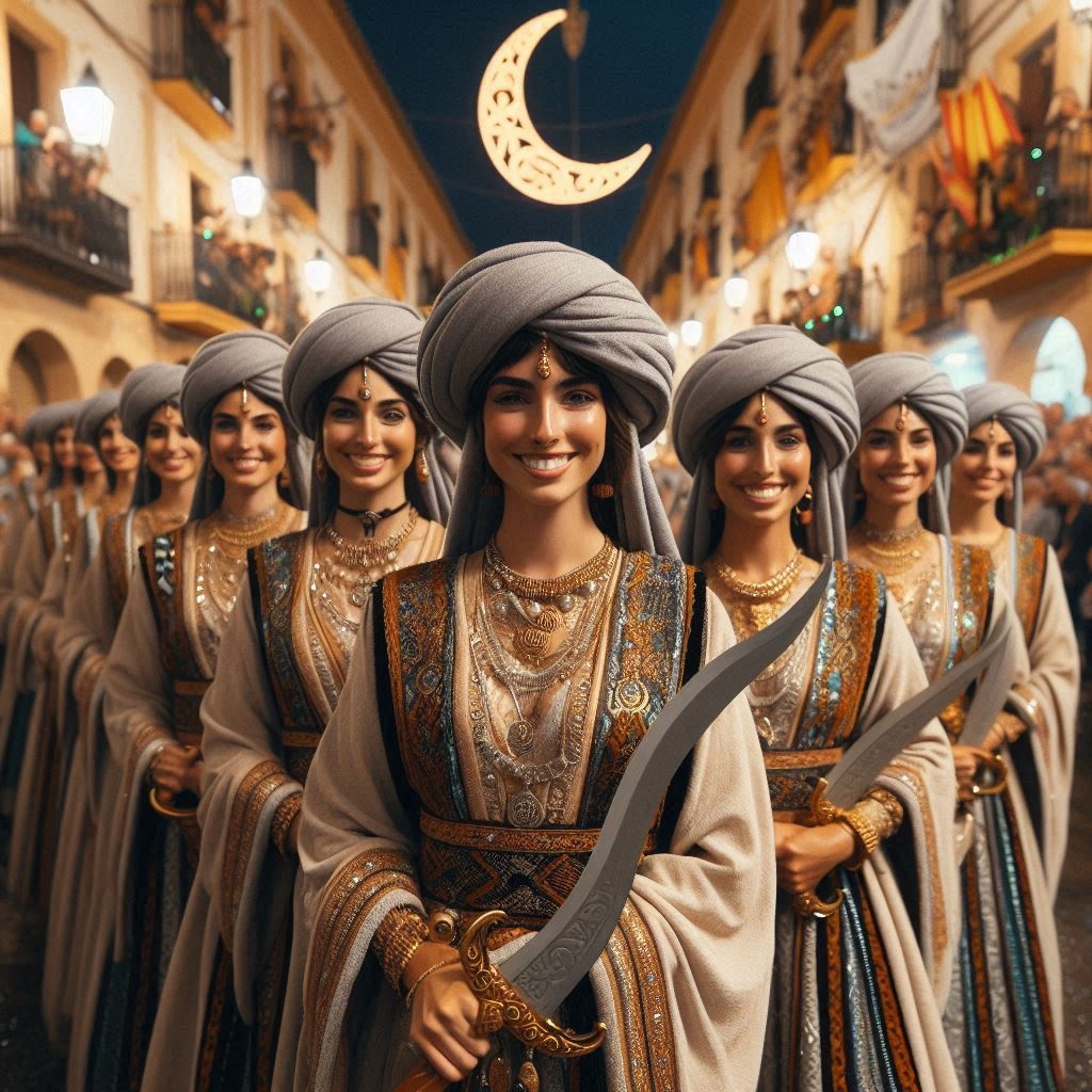 instrumental piece inspired by traditional Spanish “Marcha Mora” style, as used in the Moros y Cristianos festivals, The composition should be majestic, solemn and exotic, evoking the grandeur of Moorish armies entering a city, Use orchestration typical of a Spanish wind band: trumpets, French horns, euphoniums, tubas, clarinets, oboes, flutes, along with deep percussion such as snare drums, timpani, cymbals, and bass drums, Include minor or Phrygian scales and Arabic-influenced melodies, with a slow to moderate tempo and rich harmonic textures, The atmosphere should be mystical, noble and ceremonial, with dramatic brass swells and ornamented woodwind passages, No vocals, purely instrumental, Emphasize modal melodies, rhythmic syncopation, and a strong sense of historical narrative, The piece should feel cinematic and rooted in Andalusian and Arabic musical aesthetics, ideal for a nighttime procession of the Moorish side