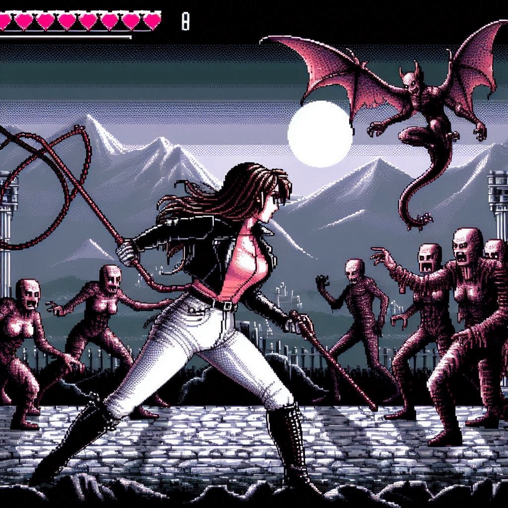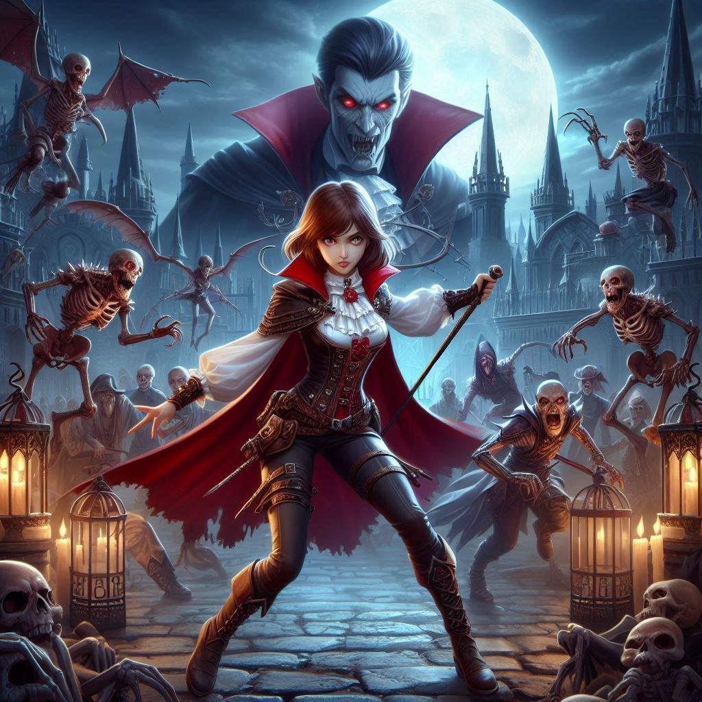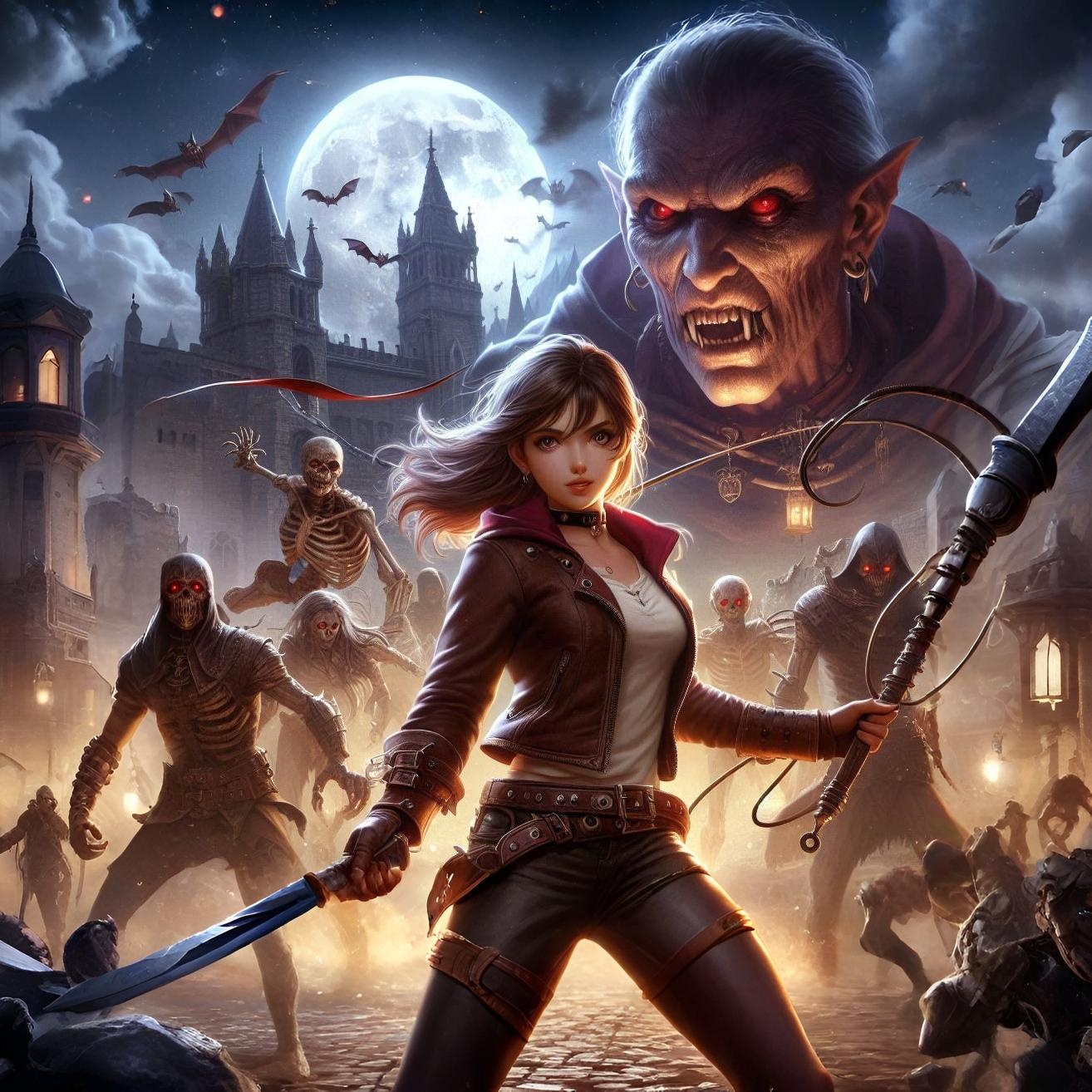 Gothic rock, baroque metal, chiptune and video game soundtrack style with no vocals, Heroe melodic, Features distorted electric guitar, gothic pipe organ, harpsichord, orchestral staccato strings, retro synth leads, punchy electronic drums, and deep bass, Fast-paced (140–150 BPM) and dramatic, with dark harmonic minor melodies, arpeggios, and energetic rhythm, Evokes a 90s vampire-hunting video game boss fight, Mood is intense, mysterious, epic, and gothic, blending classical and metal with retro fantasy energy, Ideal for a final level or boss theme in a dark fantasy action game