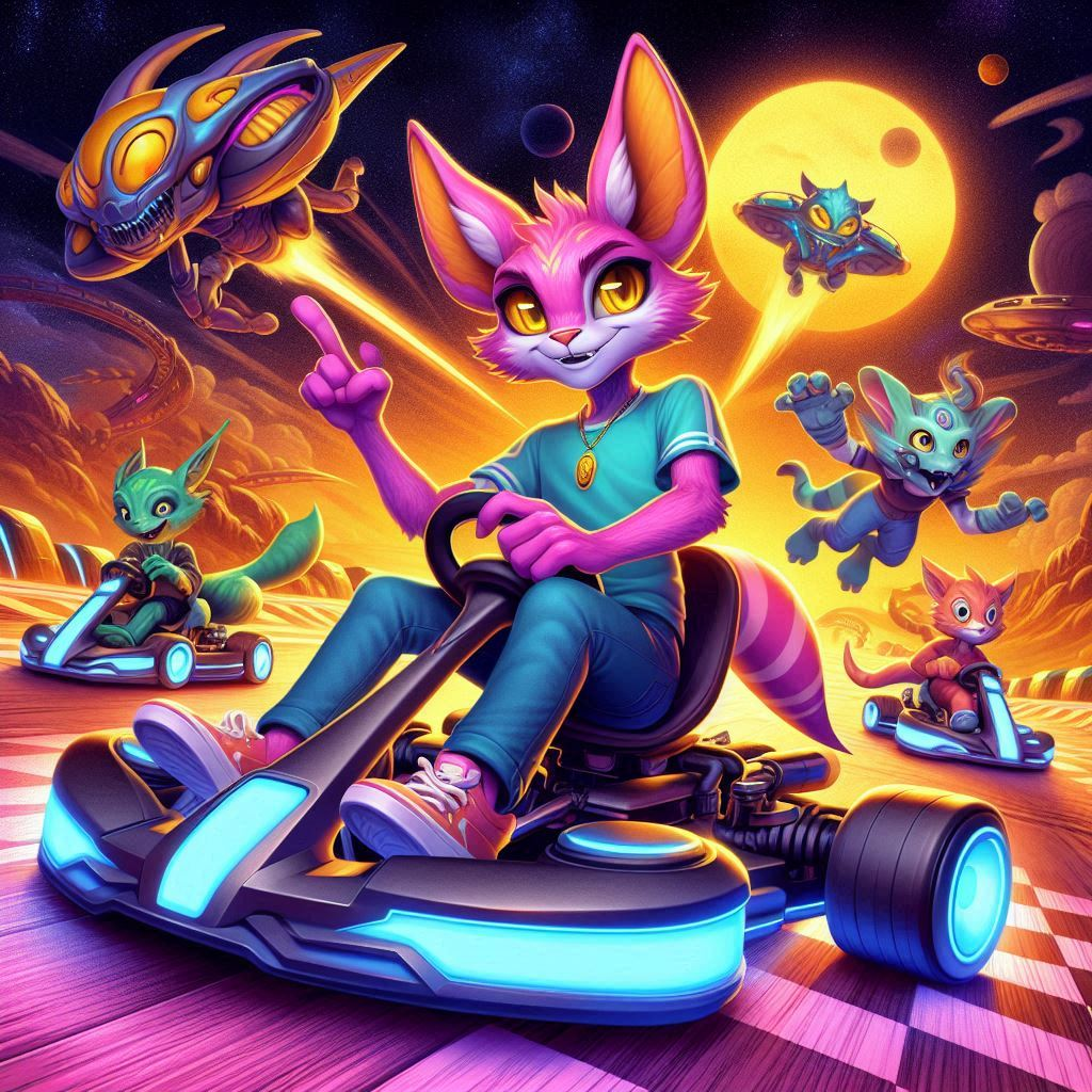 Fast-paced, synth-heavy instrumental track for a kart racing game level set in a mysterious futuristic environment, Features energetic electronic drums with syncopated rhythms, bold catchy synth melodies in a major key, heroic chord progressions, and bouncy basslines, Includes shimmering arpeggios, echoing leads, and layered textures that build a sense of urgency and adventure, The mood is fun, uplifting, and slightly dramatic — ideal for a high-speed race through glowing tunnels or alien caves at night, Not too dark or serious — the tone remains playful yet epic, The instrumentation blends retro game charm with cinematic energy, Designed to loop seamlessly, with clear melodic themes and variation between sections to simulate gameplay progression, Perfect for evoking the thrill of a final lap with a touch of wonder and heroic excitement