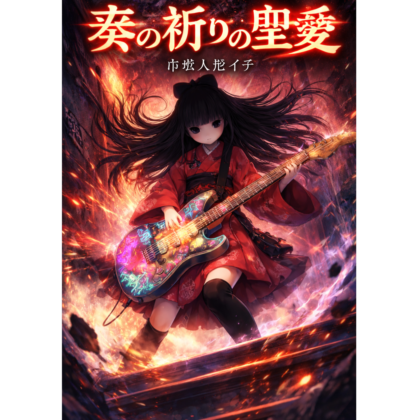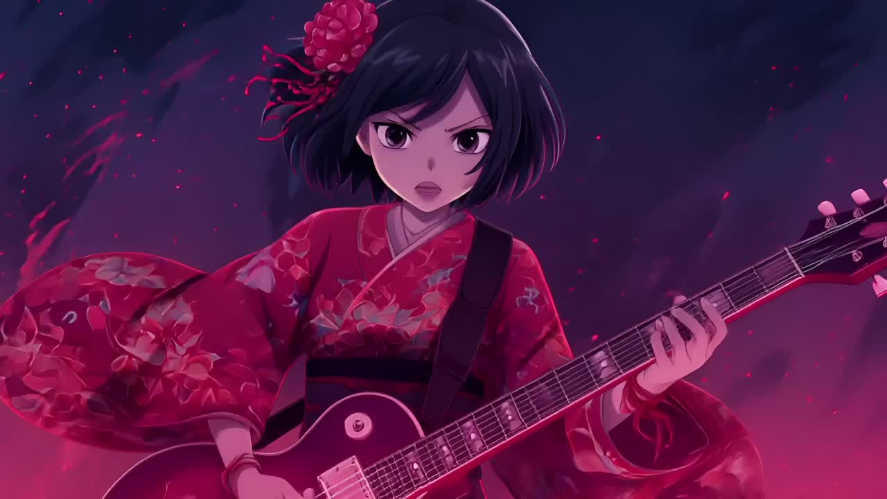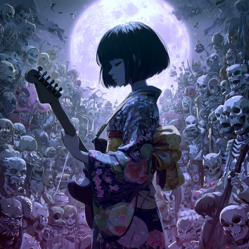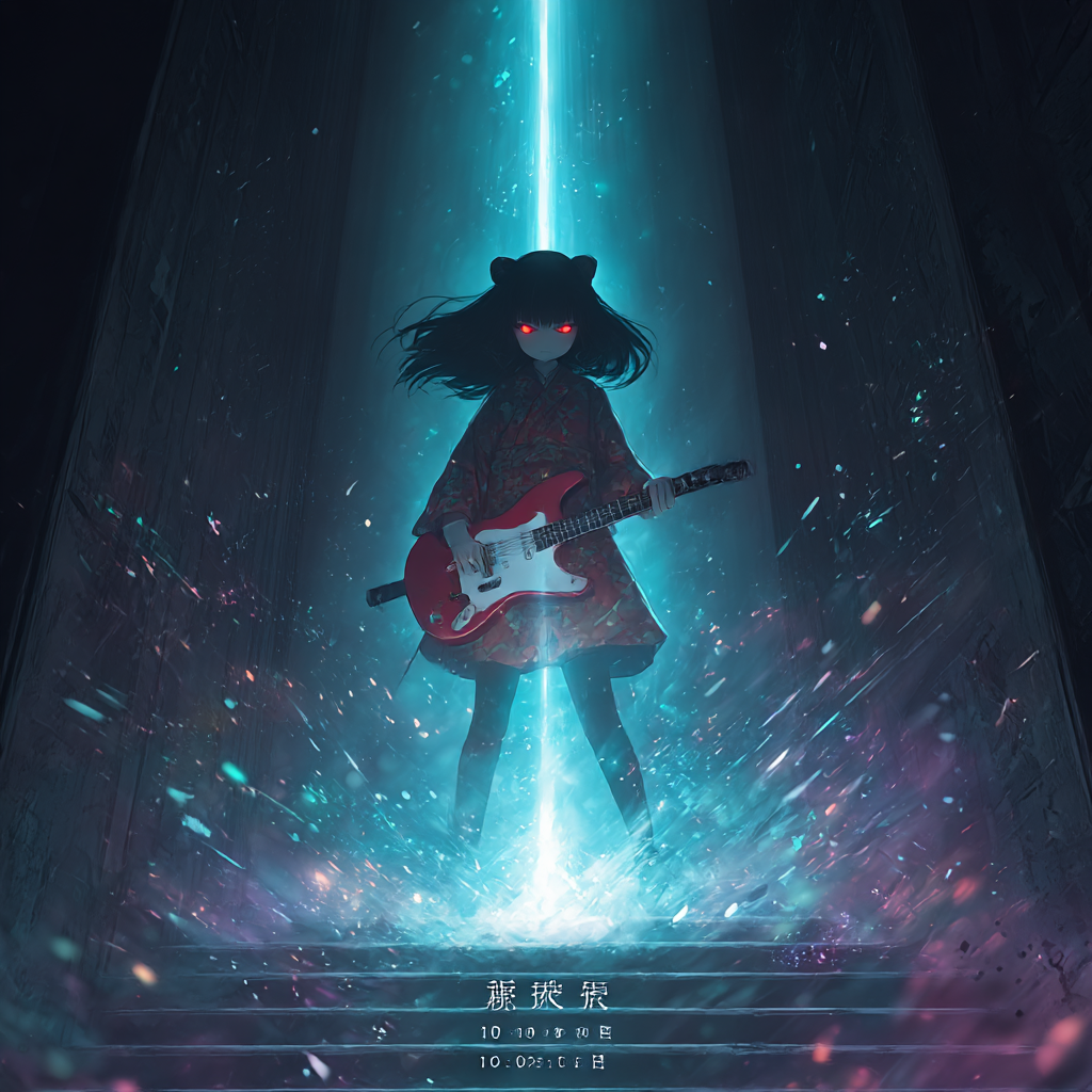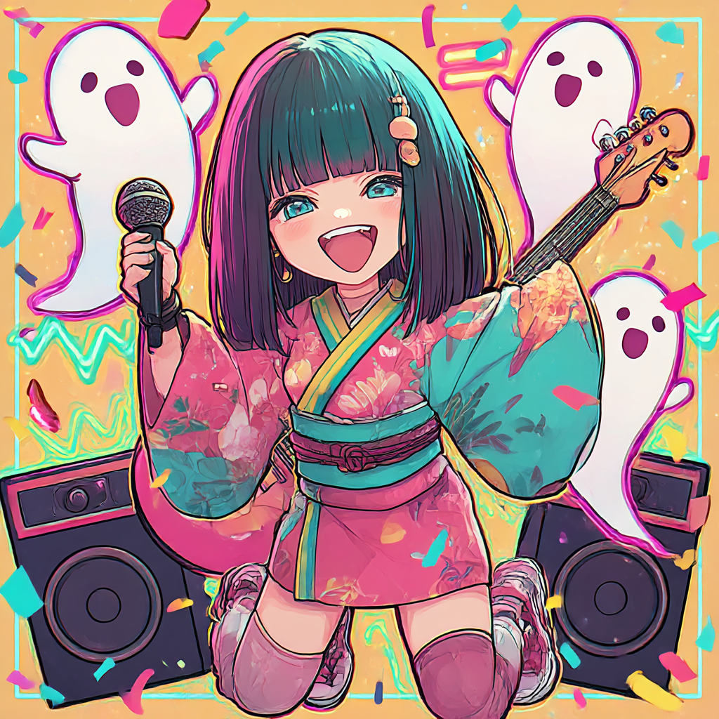 Powerful guitar riff, energetic rock, Japanese horror pop, cute but strong, chibi spirit, female vocal, fast tempo, uplifting, heroic, dark fantasy with hope, cinematic energy