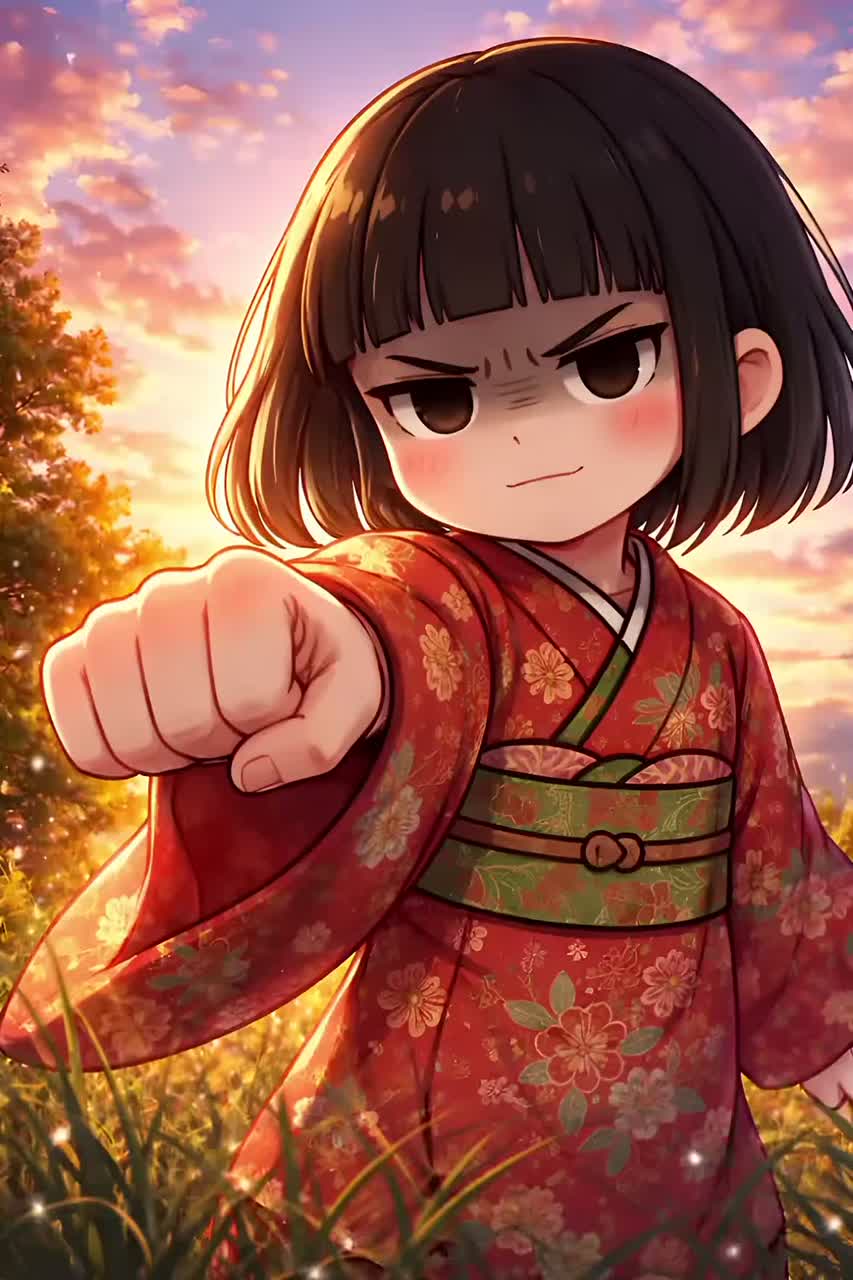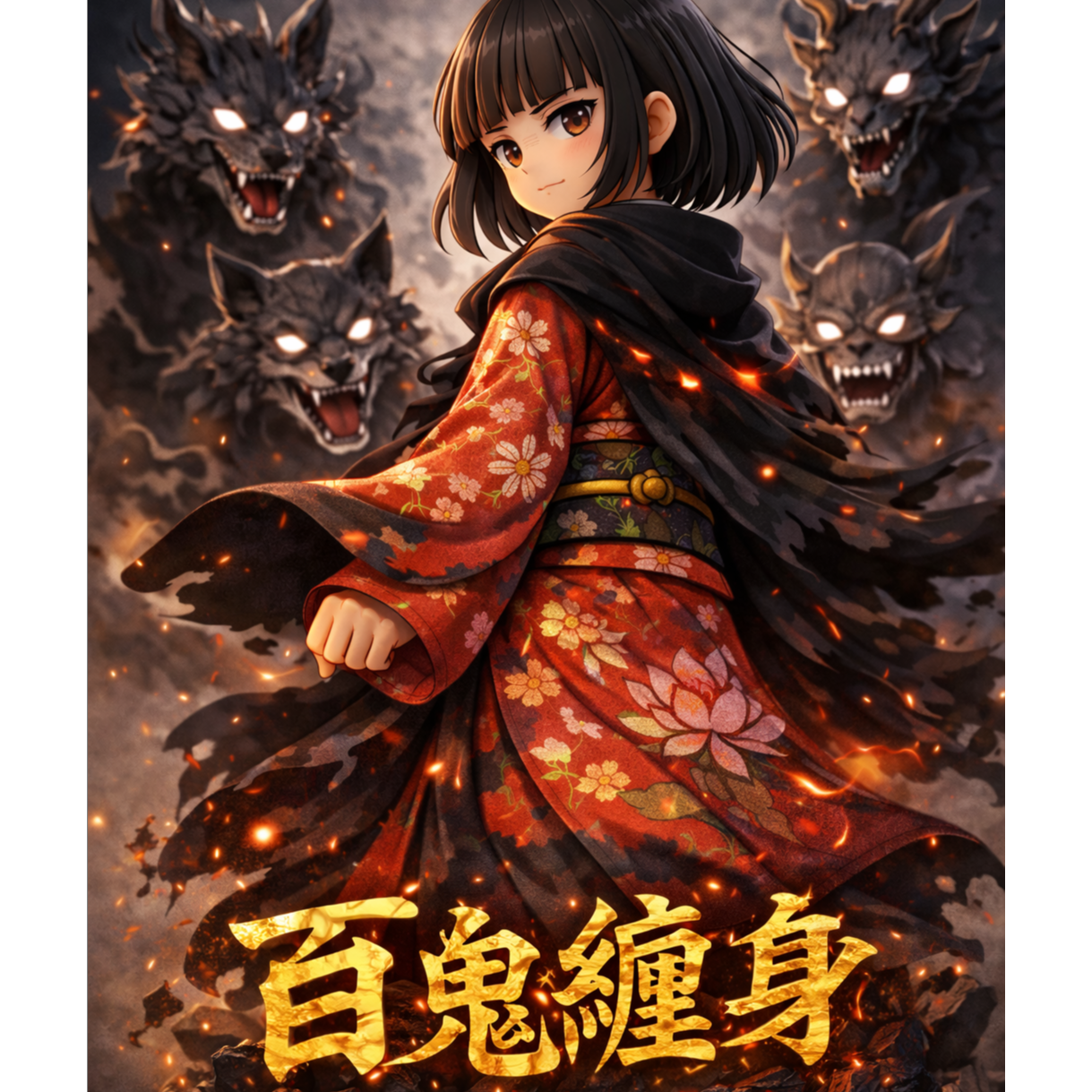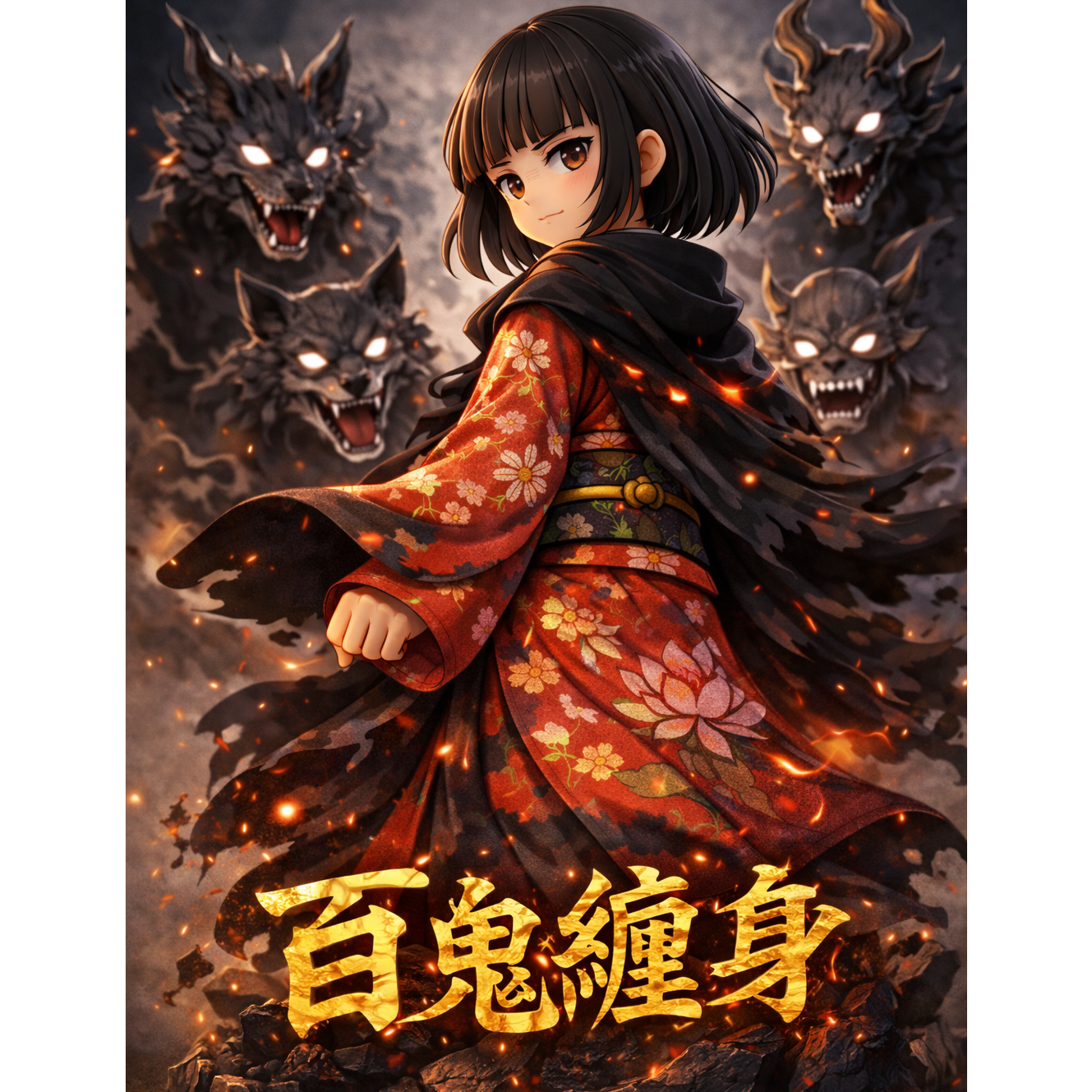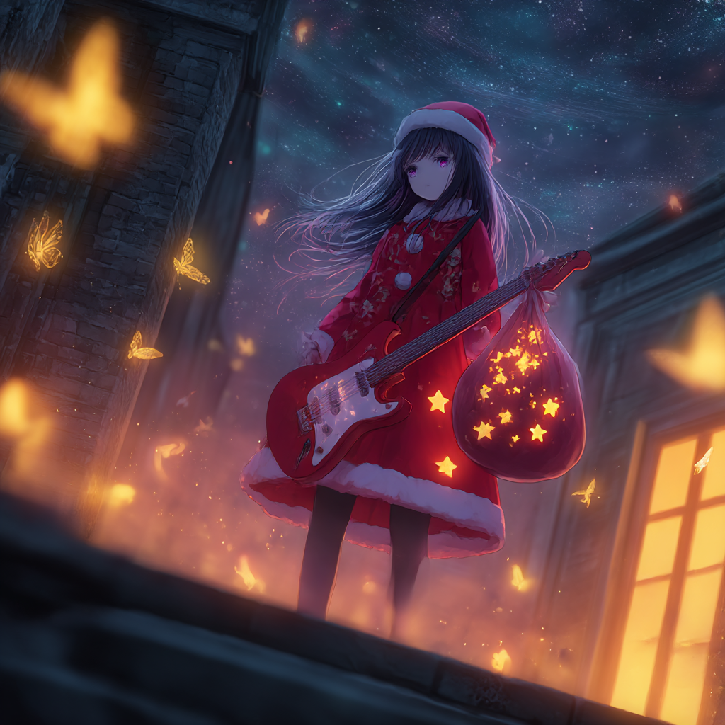 Powerful guitar riff, energetic rock, Japanese horror pop, cute but strong, chibi spirit, female vocal, fast tempo, uplifting, heroic, dark fantasy with hope, cinematic energy