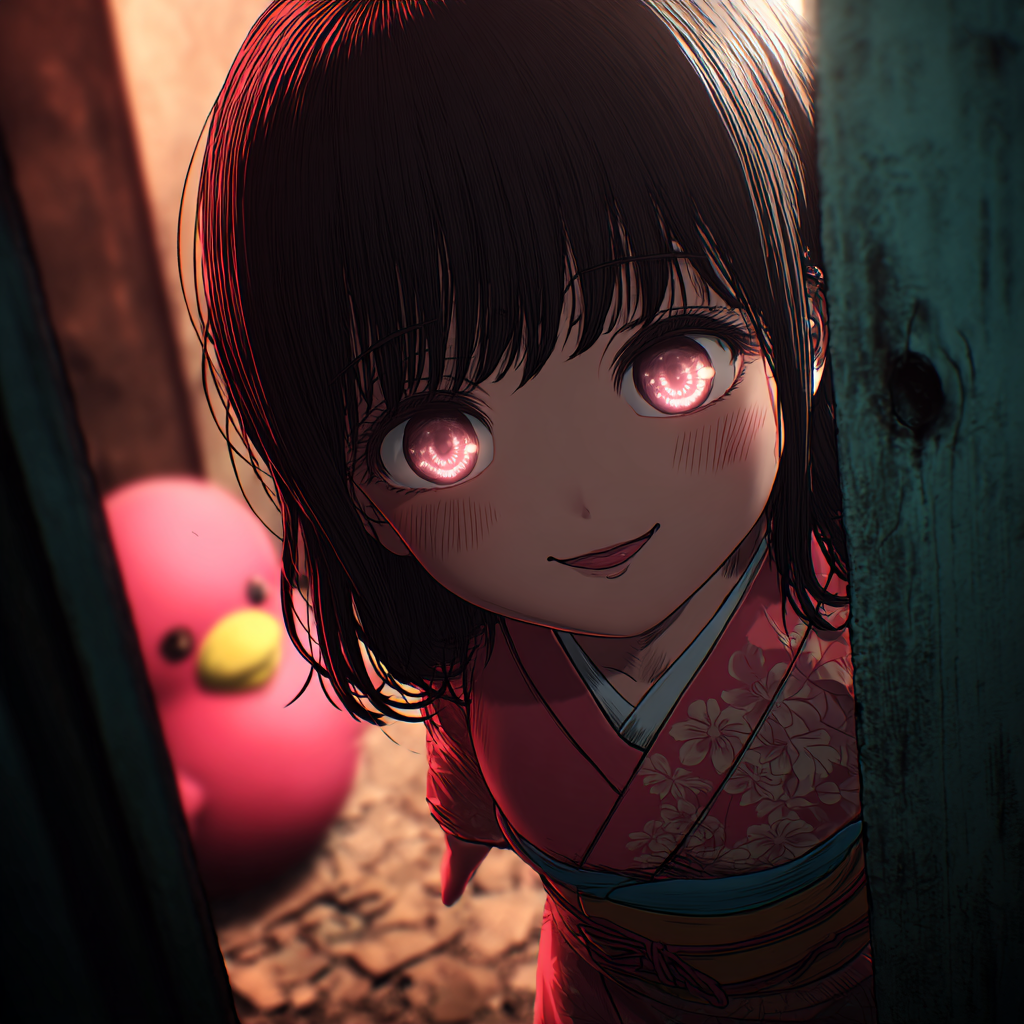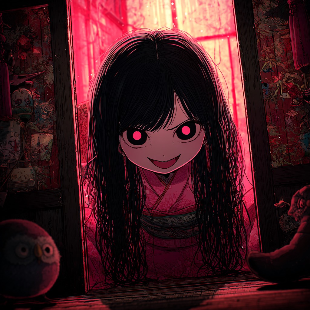 Dark Japanese horror with echoing music box tones, ritualistic taiko pulses, whispered vocals and glitchy child's laughter