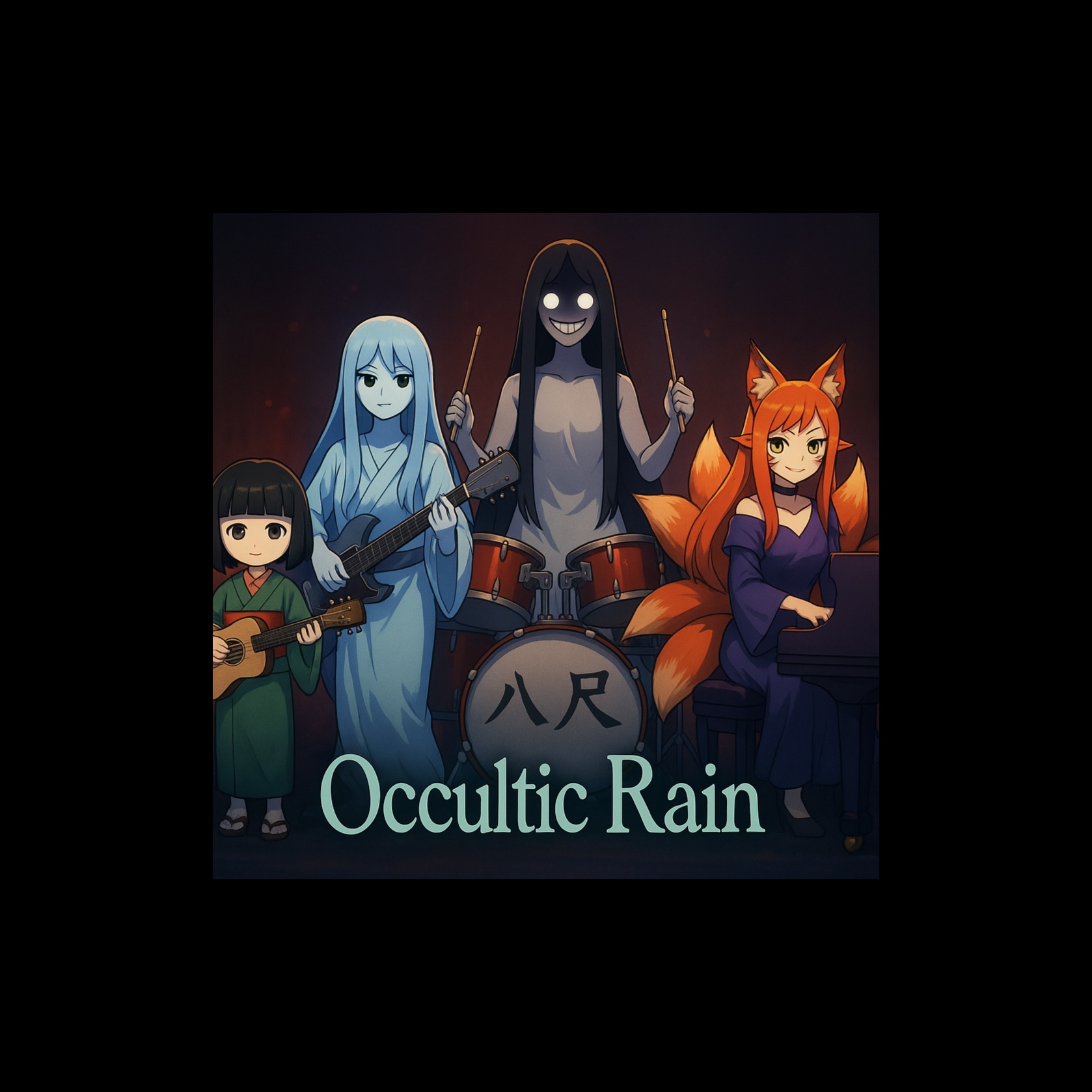 Dark Japanese rock with electric guitar solos, heavy drums, taiko-inspired beats, demonic shouts, blending traditional yokai imagery with metal energy