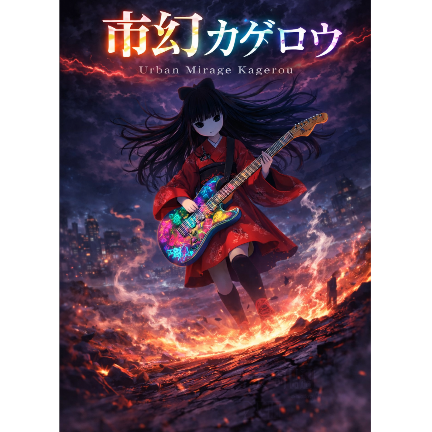 Aggressive guitar-driven rock with DJ energy, Distorted lead guitar cuts through foggy ambience, Loud drums, urban night atmosphere, Explosive chorus, emotional solo, Mirage-like, cinematic, powerful