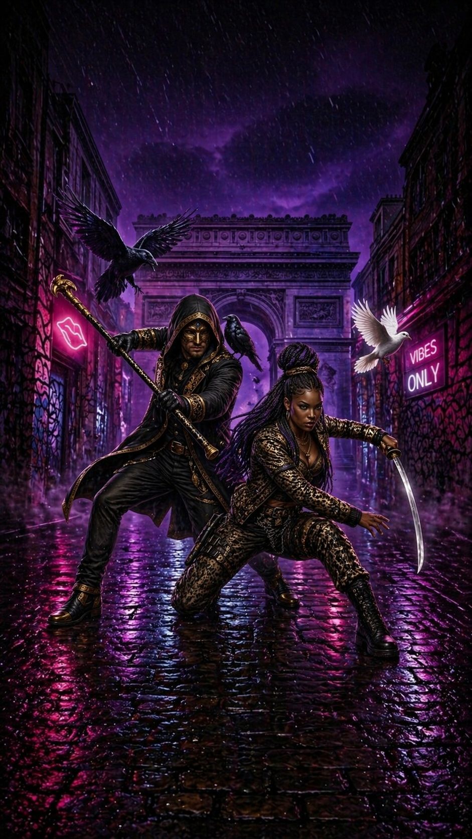 Style: dark cinematic, industrial, cabaret, seductive, aggressive, 132BPM, masterpiece, female Cajun French raspy breathy rhythmic rap, male deep sensual rhythmic rap, free-flow, harmonized, humming, rhythmic rap, drones, reverb drones, synth conga, reverb acoustic, reverb cello, opposing heavy/synth bass, building tension, fluid electric kickdrum, acoustic guitar, French horn, synth beat pad, synth snares, water drop beats, distorted snaps, hand claps, steel guitar, Arabian parkour, climax, drone step