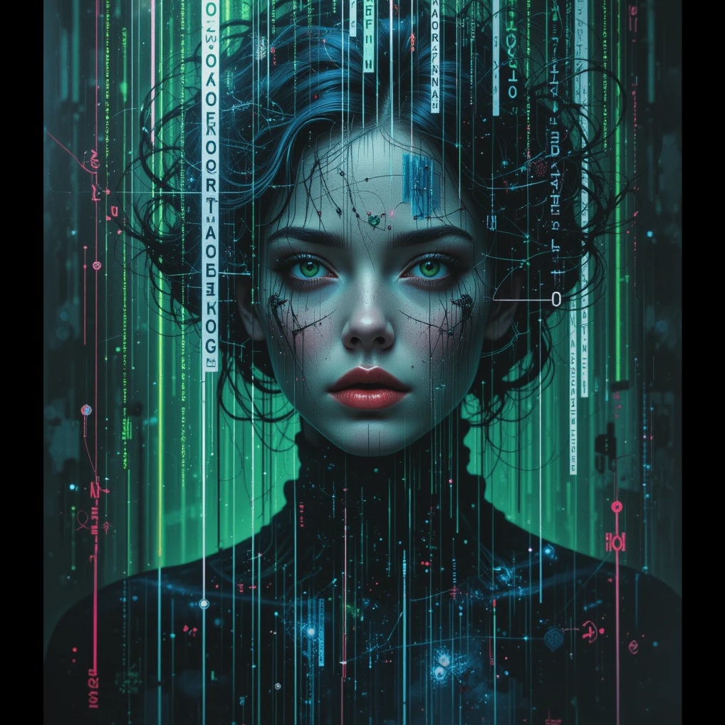 Slow Industrial Techno x Halftime DnB hybrid, glitch atmospheres, whispered cyber-poetry, broken beats, acid textures, digital solitude