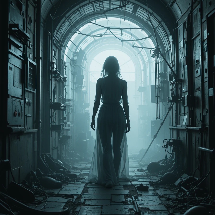Minimal Techno, BPM ~102, sparse kick-snare pattern, filtered sub pulses, cold ambient layers, whisper FX, eerie loop logic, mechanical dread