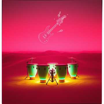 syncopated electric bongo drums 175 BPM, epic drops, desert, intricate guitar riffs, CYMBALS, cow bell