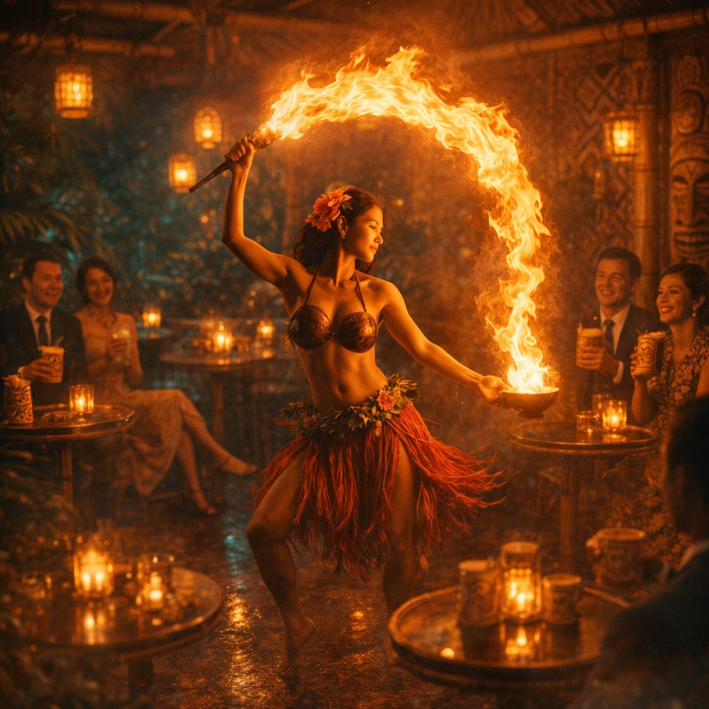 Smooth mid-century cocktail jazz with a tiki flair, Smoky saxophone melodies and warm upright bass lines create a swaying rhythm, accented by vibraphone and brushed drums, A muted trumpet drifts through the mix like cigarette smoke in a lounge, while subtle tiki bar ambiance—ice clinking in glasses, quiet murmurs, and the occasional rustle of palms—adds texture, Hints of Latin percussion and laid-back bossa nova guitar bring a touch of the exotic without overpowering the refined, lounge-forward sound