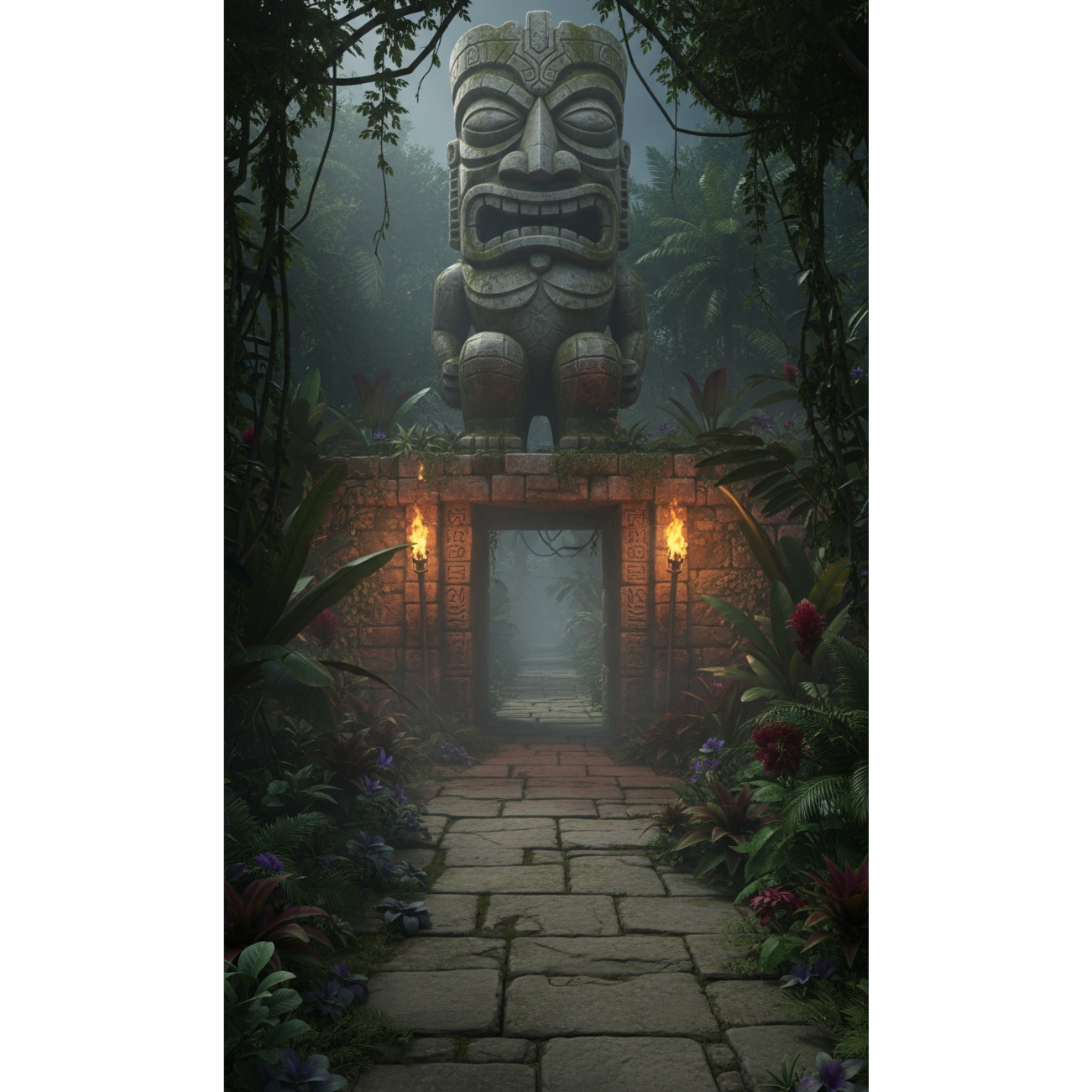 Classic mid-century exotica with a throwback vintage tiki sound, A lush, hypnotic atmosphere, Sharp, clear vibraphone carries the melody, joined by warm, breathy flute harmonies and distant harp glissandos, The rhythm is slow and entrancing — a gentle, tribal pulse of hand percussion (bongos, congas, shakers, temple blocks) and deep, resonant drum hits, with only subtle touches of upright bass to anchor the tone, Frog croaks, jungle ambience, and tropical bird calls weave through the soundscape, evoking a nocturnal island ritual, Melodic lines follow Eastern scales and Polynesian-inspired modes, colored by bamboo, koto, gamelan tones, and the occasional low gong, Spacious, reverb-kissed production conjures flickering torchlight, still lagoons, and the dreamlike allure of lost tropical temples, Minimal, mysterious, and transportive — pure early exotica, ‑guitar, ‑contemporary jazz, ‑flamenco, ‑Spanish guitar, ‑Caribbean