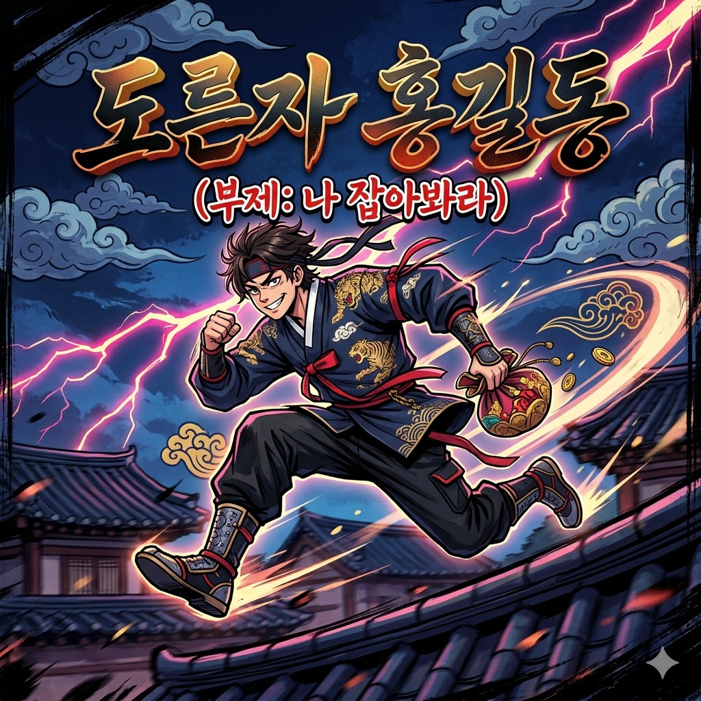Identity defines the track as a high-energy Comic Fusion Gugak Rock OST with a male vocalist and a defiant, mischievous genre feel, Mood includes a fast, driving tempo, mischievous and heroic emotional mood, in G major, Instruments: Traditional Korean Samulnori percussion (Kkwaenggwari, Janggu, Buk) provides intense, fast rhythms alongside heavy funky slap bass and a driving rock drum kit, Daegeum and Haegeum play playful, fast-paced melodies, Performance: The male vocalist delivers lyrics with a cheeky texture and theatrical delivery, During the [Rhythmic Spoken] sections, the music maintains high energy with Samulnori beats while the vocalist speaks in a mocking tone, Production: The production features a wide stereo field, dry reverb for clarity, forward vocal placement, and a clean, punchy mix to highlight the explosive traditional percussion and modern rock fusion